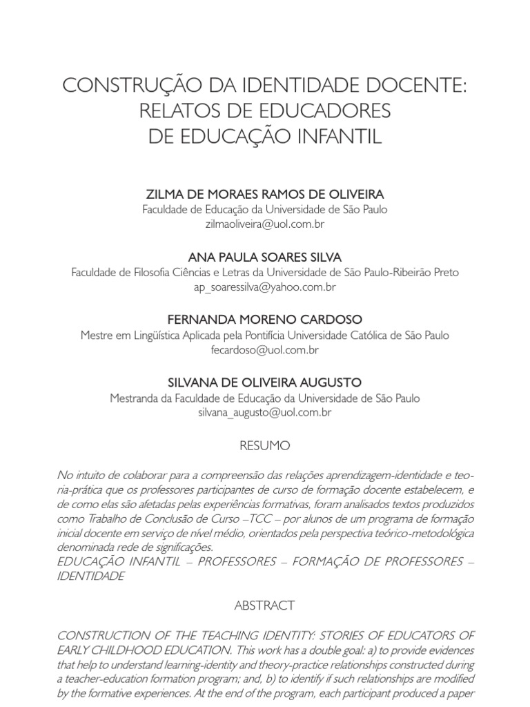 Existe hoje um consenso segundo o qual se afirma que o professor não deve ser visto apenas como um técnico em questões de ensino, mas como pessoa em processo de construir mudanças em sua identidade e no “sentido de si”. Todo professor tem algum tipo de discurso sobre sua prática pedagógi- ca, elaborado pela apropriação de uma sabedoria relacionada a experiências concretas que lhe dão pistas orientadoras para sua ação, sendo a reflexividade uma ferramenta para a construção de conhecimento sobre qualquer atividade (Seeger, 2001). Assim, discussões sobre programas de formação docente de- vem investigar como a relação do professor com o seu próprio processo de aprender é neles trabalhada e de que maneira ocorre a construção de sua iden- tidade docente (Fontana, 2000; Gatti, 2003; Maués, 2003; Oliveira, 1978; Oliveira-Formosinho, 2002; Perrenoud, 2002). O desenvolvimento pessoal e profissional de um professor é um pro- cesso complexo e tecido conforme ele se posiciona em relação a múltiplas e, por vezes, contraditórias situações. Para tanto, contribuem também múltiplos e, por vezes, contraditórios significados, pontos de vista, valores morais, crenças expressos pelos discursos elaborados por vários interlocutores que se situam nos diferentes contextos criados nas instituições sociais, nos vários campos cien- tíficos, nas legislações, nas experiências sindicais etc. Para conhecer mais sobre o processo de formação docente, a realidade dos profissionais da educação infantil constitui campo fértil de investigação. Há já vários anos, o trabalho em creche vive um período de transição entre uma concepção que o definia como de cunho assistencial para outra, que passou a acentuar a dimensão pedagógica de educação e cuidado de crianças bem pe- quenas. As novas significações em construção produzem um embate teórico- prático que acompanha a constituição de nova identidade: a de professor (Ongari, Molina, 2003). A necessidade de atender à Lei de Diretrizes e Bases da Educação 9.394/ 1996 encarregou-se de levar essa discussão aos educadores em exercício nas creches e pré-escolas, mediante programas de formação. Para muitos desses profissionais, voltar a estudar pode significar uma transformação tanto nas suas