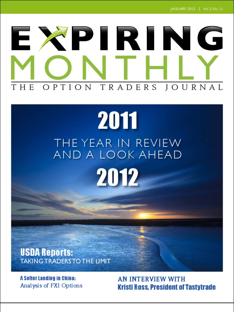 Happy New Year from the Expiring Monthly team! We look forward to another great year of the timeliest, interesting, and informative content that is available in the options space. This month is an especially fun month, if not eclectic. Any time we do a year in review and look ahead it opens this magazine to all sorts of thoughts and ideas. For our feature, Jared, Bill, myself, and guest contributor Andrew Giovinazzi each give our take on the year that was and the year ahead. Also in this months issue is an intriguing analysis of a trade in FXI options. We follow that up with new guest contributor Zachary Fietsch who brings us an analysis on USDA reports and their effect on futures traders. Following Zachs piece, Mark Sebastian sits down with Kristi Ross, the president of the new internet financial network Tastytrade, which already seems to be making waves in the financial media. Following our featured section, Bill continues his piece from last month with Using VIX ETPs as Hedges: Part Two, along with a great Follow That Trade that attempts to create an arb between VXX and VIX. This sandwiches a great floor story from trading floor veteran and frequent guest contributor, Andrew Giovinazzi. Finally, in a first we bring in a non-trader, but expert fashionista to discuss womens retail shopping habits. My wife and popular blogger from BigBlondeHair.com, Lauren Sebastian basically lays out why she doesnt have to shop at Sears. This is going to be a fun one to read this month, enjoy and happy trading. As always, readers are encouraged to send questions, comments or guest article contribution ideas to editor@expiringmonthly.com. Mark Sebastian Contributing Editor