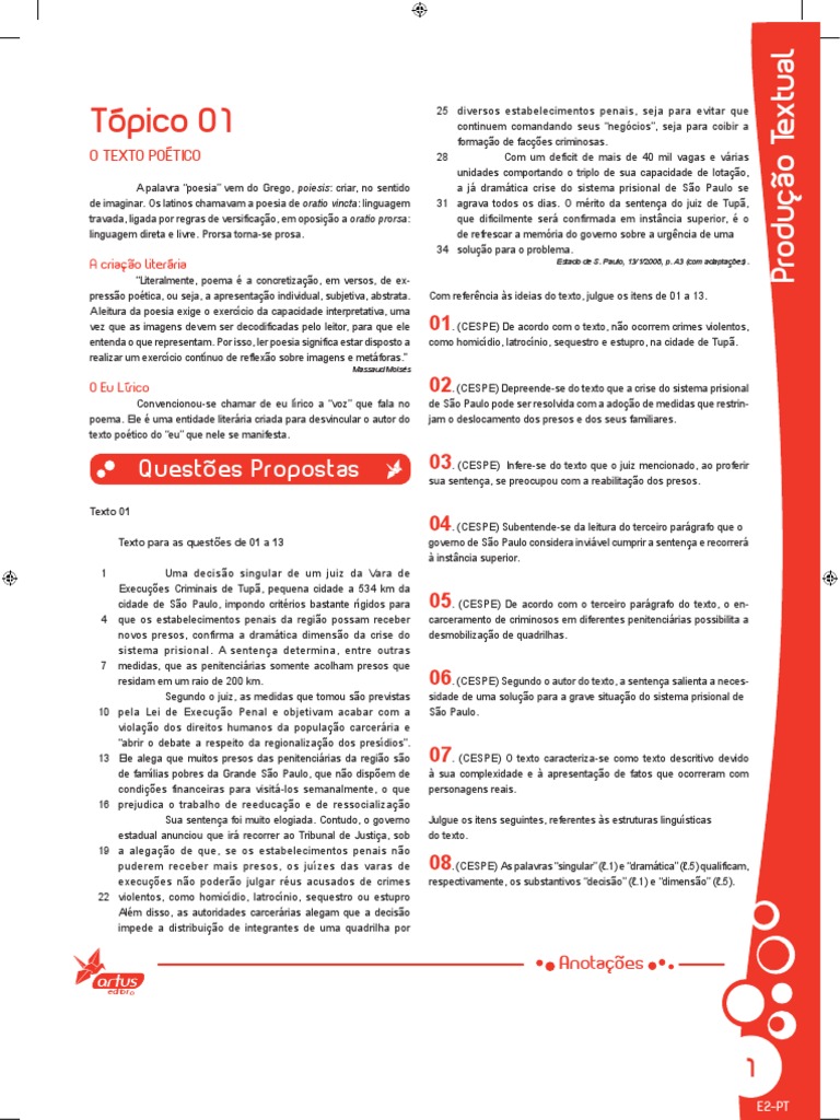 Texto 01 Texto para as questes de 01 a 13 1 Uma deciso singular de um juiz da Vara de Execues Criminais de Tup, pequena cidade a 534 km da cidade de So Paulo, impondo critrios bastante rgidos para que os estabelecimentos penais da regio possam receber novos presos, confirma a dramtica dimenso da crise do sistema prisional. A sentena determina, entre outras medidas, que as penitencirias somente acolham presos que residam em um raio de 200 km. Segundo o juiz, as medidas que tomou so previstas pela Lei de Execuo Penal e objetivam acabar com a violao dos direitos humanos da populao carcerria e abrir o debate a respeito da regionalizao dos presdios. Ele alega que muitos presos das penitencirias da regio so de famlias pobres da Grande So Paulo, que no dispem de condies financeiras para visit-los semanalmente, o que prejudica o trabalho de reeducao e de ressocializao Sua sentena foi muito elogiada. Contudo, o governo estadual anunciou que ir recorrer ao Tribunal de Justia, sob a alegao de que, se os estabelecimentos penais no puderem receber mais presos, os juzes das varas de execues no podero julgar rus acusados de crimes violentos, como homicdio, latrocnio, sequestro ou estupro Alm disso, as autoridades carcerrias alegam que a deciso impede a distribuio de integrantes de uma quadrilha por