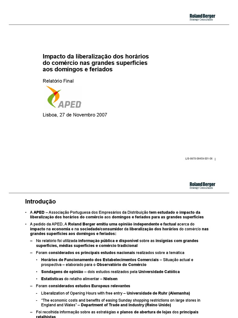 A APED Associao Portuguesa dos Empresrios da Distribuio tem estudado o impacto da liberalizao dos horrios do comrcio aos domingos e feriados para as grandes superfcies A pedido da APED, A Roland Berger emitiu uma opinio independente e factual acerca do impacto na economia e na sociedade/consumidor da liberalizao dos horrios do comrcio nas grandes superfcies aos domingos e feriados: No relatrio foi utilizada informao pblica e disponvel sobre as insgnias com grandes superfcies, mdias superfcies e comrcio tradicional Foram considerados os principais estudos nacionais realizados sobre a temtica Horrios de Funcionamento dos Estabelecimentos Comerciais Situao actual e prospectiva elaborado para o Observatrio do Comrcio Sondagens de opinio dois estudos realizados pela Universidade Catlica Estatsticas do retalho alimentar Nielsen Foram considerados estudos Europeus relevantes - Liberalization of Opening Hours with free entry Universidade de Ruhr (Alemanha) - The economic costs and benefits of easing Sunday shopping restrictions on large stores in England and Wales Department of Trade and Industry (Reino Unido) Foi recolhida informao sobre as estratgias e planos de abertura de lojas dos principais retalhistas