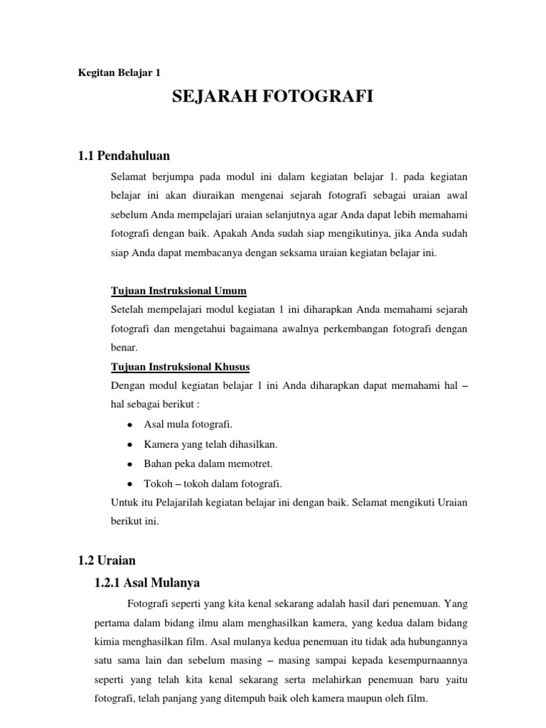 Selamat berjumpa pada modul ini dalam kegiatan belajar 1. pada kegiatan belajar ini akan diuraikan mengenai sejarah fotografi sebagai uraian awal sebelum Anda mempelajari uraian selanjutnya agar Anda dapat lebih memahami fotografi dengan baik. Apakah Anda sudah siap mengikutinya, jika Anda sudah siap Anda dapat membacanya dengan seksama uraian kegiatan belajar ini.