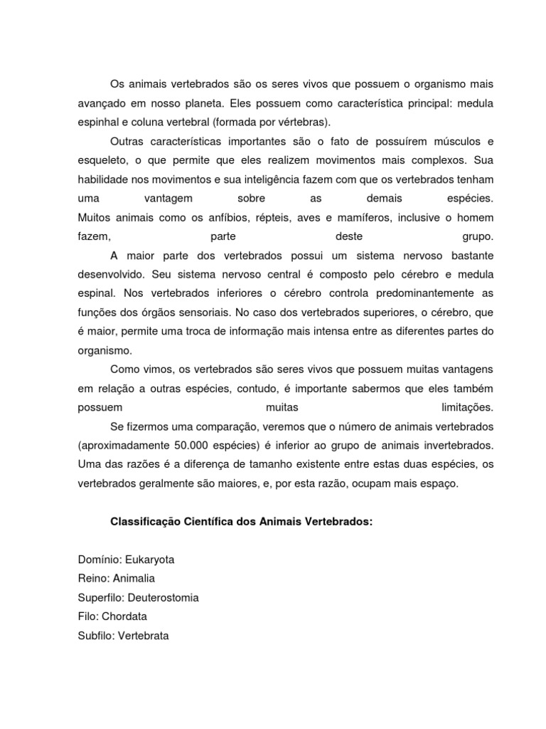 A maior parte dos vertebrados possui um sistema nervoso bastante desenvolvido. Seu sistema nervoso central composto pelo crebro e medula espinal. Nos vertebrados inferiores o crebro controla predominantemente as funes dos rgos sensoriais. No caso dos vertebrados superiores, o crebro, que maior, permite uma troca de informao mais intensa entre as diferentes partes do organismo. Como vimos, os vertebrados so seres vivos que possuem muitas vantagens em relao a outras espcies, contudo, importante sabermos que eles tambm possuem muitas limitaes.