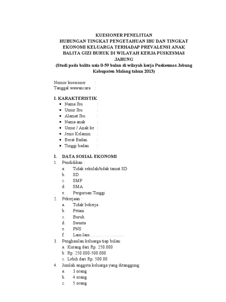 BURUK DI WILAYAH KERJA PUSKESMAS JABUNG (Studi pada balita usia 0-59 bulan di wilayah kerja Puskesmas Jabung Kabupaten Malang tahun 2013) Nomor kuesioner : Tanggal wawancara : I. KARAKTERISTIK Nama Ibu : Umur Ibu : Alamat Ibu : Nama anak : Umur / Anak ke : Jenis Kelamin : Berat Badan : Tinggi badan : I. 1. DATA SOSIAL EKONOMI Pendidikan : a. Tidak sekolah/tidak tamat SD b. SD c. SMP d. SMA e. Perguruan Tinggi Pekerjaan : a. Tidak bekerja b. Petani c. Buruh d. Swasta e. PNS f. Lain-lain...... Penghasilan keluarga tiap bulan: a. Kurang dari Rp. 250.000 b. Rp. 250.000-500.000 c. Lebih dari Rp. 500.00 Jumlah anggota keluarga yang ditanggung: a. 3 orang b. 4 orang c. 5 orang