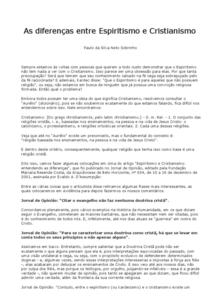 Sempre estamos s voltas com pessoas que querem a todo custo demonstrar que o Espiritismo no tem nada a ver com o Cristianismo. Isso parece ser uma obsesso para elas. Por que tanta preocupao? Ser que temem que seu conhecimento calcado na f cega seja sobrepujado pelo da f raciocinada? E ademais, Kardec disse: "Que o Espiritismo para aqueles que no possuem religio", ou seja, no estamos em busca de ningum que j possua uma convico religiosa formada. Ento qual o problema? Embora todos possam ter uma ideia do que significa Cristianismo, resolvemos consultar o "Aurlio" (dicionrio), pois se no soubermos exatamente do que estamos falando, fica difcil nos entendermos sobre isso. Nele encontramos: Cristianismo: [Do grego christianisms, pelo latim christianismu.] - S. m. Rel. - 1. O conjunto das religies crists, i. e., baseadas nos ensinamentos, na pessoa e na vida de Jesus Cristo: o catolicismo, o protestantismo, e religies ortodoxas orientais. 2. Cada uma dessas religies. Veja que at no "Aurlio" existe um preconceito, mas o fundamental do conceito : "religio baseada nos ensinamentos, na pessoa e na vida de Jesus Cristo". E dentro deste critrio, consequentemente, qualquer religio que tenha isso como base uma religio crist. Dito isso, vamos fazer algumas colocaes em cima do artigo "Espiritismo e Cristianismo: entendendo as diferenas", que foi publicado no Jornal de Opinio, editado pela Fundao Mariana Resende Costa, da Arquidiocese de Belo Horizonte, n 654, de 10 a 16 de dezembro de 2001, assinada por Evaldo A. DAssumpo: Entre as vrias coisas que o articulista disse retiramos algumas frases mais interessantes, as quais colocaremos em evidncia para depois fazermos os nossos comentrios. Jornal de Opinio: "Citar o evangelho no faz nenhuma doutrina crist". Concordamos plenamente, pois vrios exemplos na Histria da Humanidade, em os que diziam seguir o Evangelho, cometeram as maiores barbries, que no necessitam nem ser citadas, pois do conhecimento de todos ns. E, infelizmente, at nos dias atuais se "guerreia" em nome do Cristo. Jornal de Opinio: "Para se caracterizar uma doutrina como crist, h que se levar em conta todos os seus princpios e no apenas alguns". Assinamos em baixo. Entretanto, cumpre salientar que a Doutrina Crist pode no ser exatamente o que alguns pensam que ela , pois interpretaes equivocadas do passado, com uma viso unilateral e cega, ou seja, com o propsito exclusivo de defenderem determinados dogmas - e, algumas vezes, sendo essas interpretaes interesseiras e impostas fora aos fiis -, elas acabaram por deturpar os ensinamentos de Cristo. E isso veio at aos nossos dias, no por culpa dos fiis, mas porque os telogos, por orgulho, julgando-se infalveis essa a grande verdade -, no querem mudar de opinio, pois tanto se apegaram ao que diziam, que ficou difcil admitir uma verdade, alm da fronteira da sua corrente religiosa. Jornal de Opinio: "Contudo, entre o espiritismo (ou kardecismo) e o cristianismo existe um