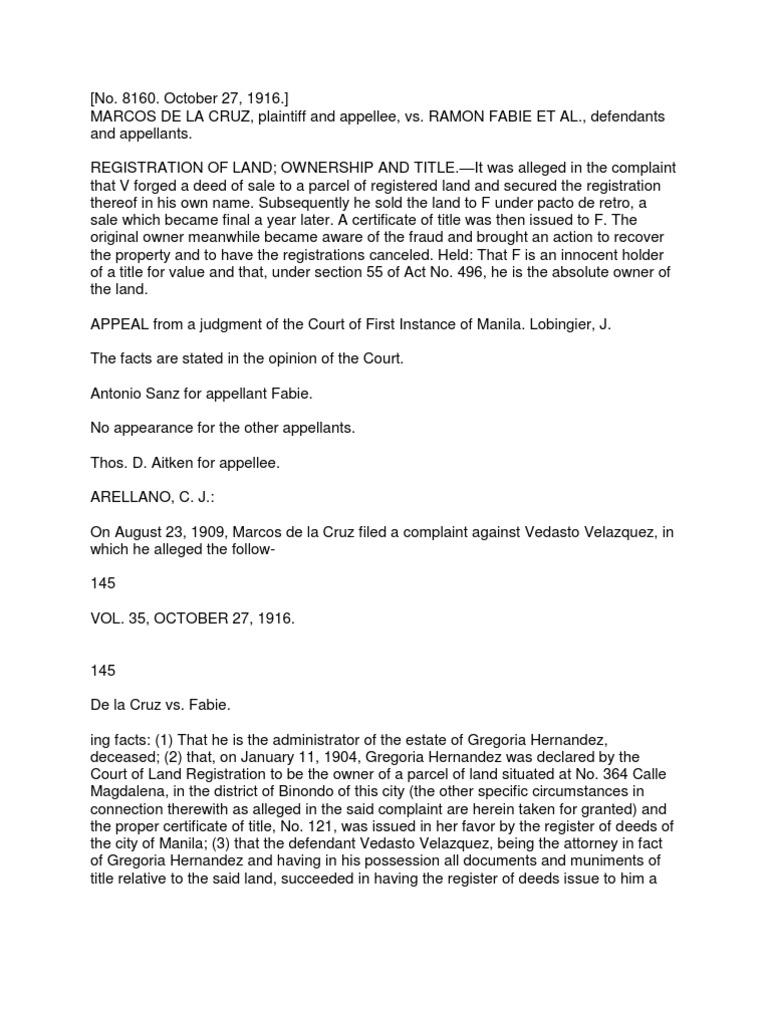 , defendants and appellants. REGISTRATION OF LAND; OWNERSHIP AND TITLE.It was alleged in the complaint that V forged a deed of sale to a parcel of registered land and secured the registration thereof in his own name. Subsequently he sold the land to F under pacto de retro, a sale which became final a year later. A certificate of title was then issued to F. The original owner meanwhile became aware of the fraud and brought an action to recover the property and to have the registrations canceled. Held: That F is an innocent holder of a title for value and that, under section 55 of Act No. 496, he is the absolute owner of the land. APPEAL from a judgment of the Court of First Instance of Manila. Lobingier, J. The facts are stated in the opinion of the Court. Antonio Sanz for appellant Fabie. No appearance for the other appellants. Thos. D. Aitken for appellee. ARELLANO, C. J.: On August 23, 1909, Marcos de la Cruz filed a complaint against Vedasto Velazquez, in which he alleged the follow145 VOL. 35, OCTOBER 27, 1916.