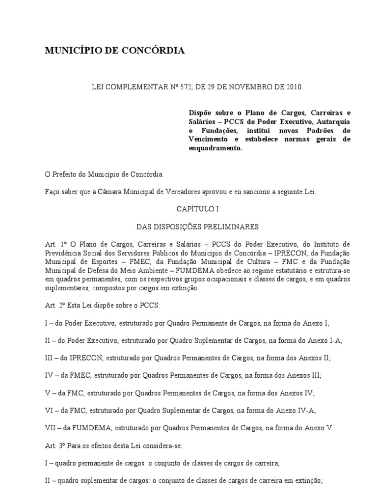 LEI COMPLEMENTAR N 572, DE 29 DE NOVEMBRO DE 2010. Dispe sobre o Plano de Cargos, Carreiras e Salrios PCCS do Poder Executivo, Autarquia e Fundaes, institui novos Padres de Vencimento e estabelece normas gerais de enquadramento. O Prefeito do Municpio de Concrdia. Fao saber que a Cmara Municipal de Vereadores aprovou e eu sanciono a seguinte Lei. CAPTULO I DAS DISPOSIES PRELIMINARES Art. 1 O Plano de Cargos, Carreiras e Salrios PCCS do Poder Executivo, do Instituto de Previdncia Social dos Servidores Pblicos do Municpio de Concrdia IPRECON, da Fundao Municipal de Esportes FMEC, da Fundao Municipal de Cultura FMC e da Fundao Municipal de Defesa do Meio Ambiente FUMDEMA obedece ao regime estatutrio e estrutura-se em quadros permanentes, com os respectivos grupos ocupacionais e classes de cargos, e em quadros suplementares, compostos por cargos em extino. Art. 2 Esta Lei dispe sobre o PCCS: I do Poder Executivo, estruturado por Quadro Permanente de Cargos, na forma do Anexo I; II do Poder Executivo, estruturado por Quadro Suplementar de Cargos, na forma do Anexo I-A; III do IPRECON, estruturado por Quadros Permanentes de Cargos, na forma dos Anexos II; IV da FMEC, estruturado por Quadros Permanentes de Cargos, na forma dos Anexos III; V da FMC, estruturado por Quadros Permanentes de Cargos, na forma dos Anexos IV; VI da FMC, estruturado por Quadro Suplementar de Cargos, na forma do Anexo IV-A; VII da FUMDEMA, estruturado por Quadros Permanentes de Cargos, na forma do Anexo V. Art. 3 Para os efeitos desta Lei considera-se: I quadro permanente de cargos: o conjunto de classes de cargos de carreira; II quadro suplementar de cargos: o conjunto de classes de cargos de carreira em extino;