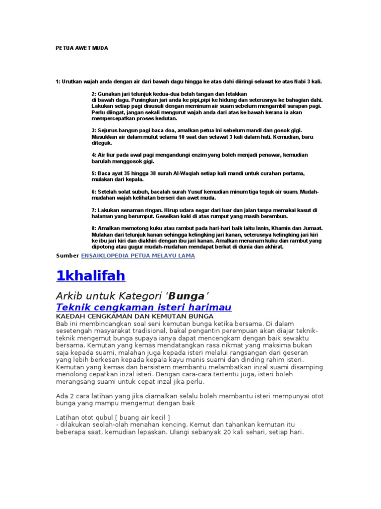 Latihan ini boleh saja dilakukan diwaktu santai atau ketika memandu atau sewaktu di tempat kerja. Latihan otot dubur [ buang air besar] - dilakukan seolah-olah menahan najis. Lakukannya 20 kali sehari selepas melatih otot pertama/qubul Teknik-Teknik Cengkaman dan Kemutan Bunga Kemutan Beserta Diam Dilakukan apabila suami mendiamkan kayu manisnya tanpa berdayung. Kemutan yang dilakukan apabila suami berehat sebentar dalam keadaan kayu manis diberhentikan dari berdayung dan diredamkan di dalam bunga akan memberi rasa cengaman yang hebat kepada suami, dan ketika itulah suami akan merasa bagaimana bunga itu memegang dan melepaskan cengkamannya pada kayu manis. Kemutan Beserta Sorong Kemutan apabila suami menyorongkan kayu manisnya. Kemutan yang dilakukan apabila suami menyorongkan kayu manisnya dalam dayungan dan melepaskan kemutan itu semasa suami menarik kayu manisnya akan mempercepatkan suami inzal maninya atau ejakulasi. Ini dilakukan jika suami adalah lelaki yang tahan lama apabila bersama, atau sekiranya keadaan lubang bunga terlalu licin akibat air mazi isteri yang banyak keluar atau apabila liang rahim longgar akibat banyak kali bersalin. Kemutan Beserta Tarik Dilakukan semasa suami menarik kayu manisnya akan membantu suami lambat inzal dan mempercepatkan orgasme pihak isteri. Gerakan suami menarik kayu manis dalam dayungan yang dibantu oleh kemutan bunga isteri akan mengurut batang kayu manis ke arah hujung atau kepala kayu manis dan ini membantu melambatkan inzal suami. Sebaliknya bagi isteri, apabila mencengkam kayu manis yang sedang ditarik dari liang bunga akan menerbitkan rasa nikmat yang maksima dalam bersama. Nikmat ini akan terasa lebih hebat lagi jika tempo suami menarik lebih pantas daripada ketika menyorong kayu manis.