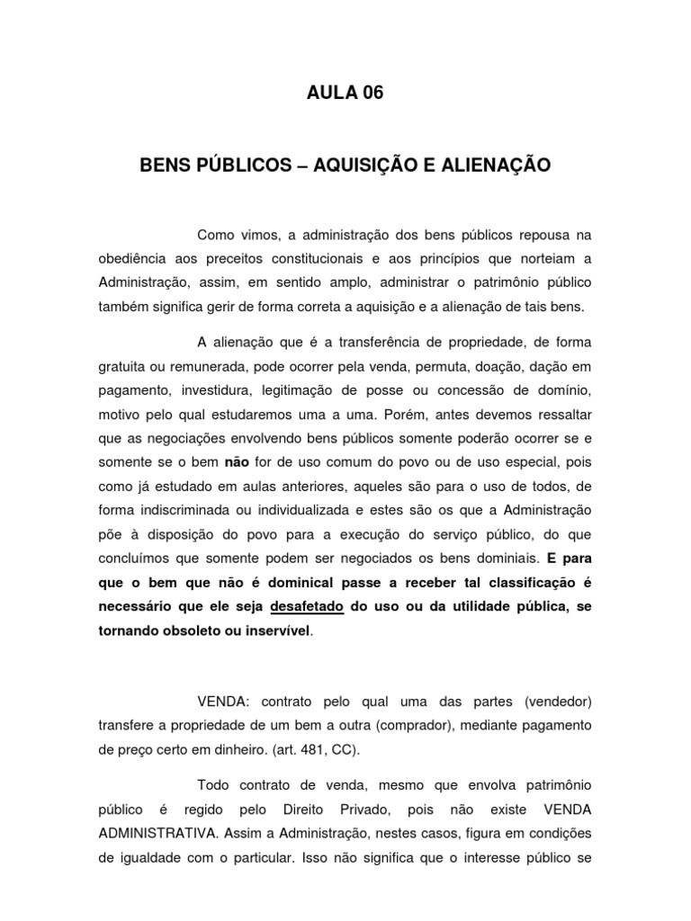 Como vimos, a administrao dos bens pblicos repousa na obedincia aos preceitos constitucionais e aos princpios que norteiam a Administrao, assim, em sentido amplo, administrar o patrimnio pblico tambm significa gerir de forma correta a aquisio e a alienao de tais bens. A alienao que a transferncia de propriedade, de forma gratuita ou remunerada, pode ocorrer pela venda, permuta, doao, dao em pagamento, investidura, legitimao de posse ou concesso de domnio, motivo pelo qual estudaremos uma a uma. Porm, antes devemos ressaltar que as negociaes envolvendo bens pblicos somente podero ocorrer se e somente se o bem no for de uso comum do povo ou de uso especial, pois como j estudado em aulas anteriores, aqueles so para o uso de todos, de forma indiscriminada ou individualizada e estes so os que a Administrao pe disposio do povo para a execuo do servio pblico, do que conclumos que somente podem ser negociados os bens dominiais. E para que o bem que no dominical passe a receber tal classificao necessrio que ele seja desafetado do uso ou da utilidade pblica, se tornando obsoleto ou inservvel.