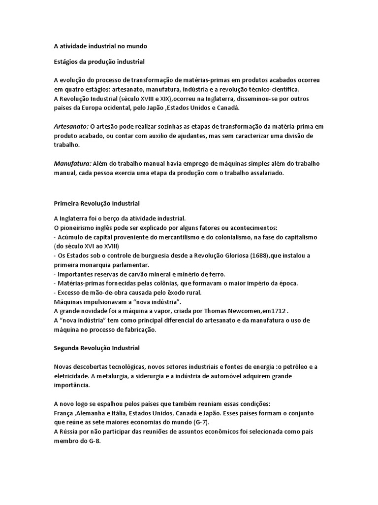 Primeira Revoluo Industrial A Inglaterra foi o bero da atividade industrial. O pioneirismo ingls pode ser explicado por alguns fatores ou acontecimentos: - Acmulo de capital proveniente do mercantilismo e do colonialismo, na fase do capitalismo (do sculo XVI ao XVIII) - Os Estados sob o controle de burguesia desde a Revoluo Gloriosa (1688),que instalou a primeira monarquia parlamentar. - Importantes reservas de carvo mineral e minrio de ferro. - Matrias-primas fornecidas pelas colnias, que formavam o maior imprio da poca. - Excesso de mo-de-obra causada pelo xodo rural. Mquinas impulsionavam a nova indstria. A grande novidade foi a mquina a vapor, criada por Thomas Newcomen,em1712 . A nova indstria tem como principal diferencial do artesanato e da manufatura o uso de mquina no processo de fabricao. Segunda Revoluo Industrial Novas descobertas tecnolgicas, novos setores industriais e fontes de energia :o petrleo e a eletricidade. A metalurgia, a siderurgia e a indstria de automvel adquirem grande importncia. A novo logo se espalhou pelos pases que tambm reuniam essas condies: Frana ,Alemanha e Itlia, Estados Unidos, Canad e Japo. Esses pases formam o conjunto que rene as sete maiores economias do mundo (G-7). A Rssia por no participar das reunies de assuntos econmicos foi selecionada como pas membro do G-8.