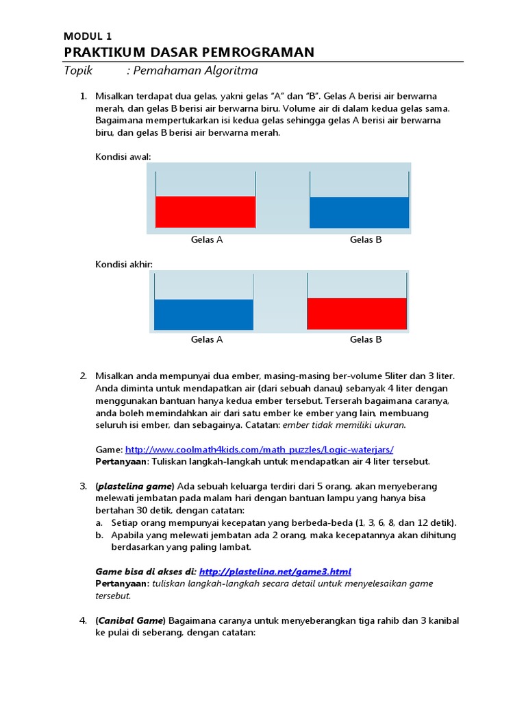 2. Misalkan anda mempunyai dua ember, masing-masing ber-volume 5liter dan 3 liter. Anda diminta untuk mendapatkan air (dari sebuah danau) sebanyak 4 liter dengan menggunakan bantuan hanya kedua ember tersebut. Terserah bagaimana caranya, anda boleh memindahkan air dari satu ember ke ember yang lain, membuang seluruh isi ember, dan sebagainya. Catatan: ember tidak memiliki ukuran. Game: http://www.coolmath4kids.com/math_puzzles/Logic-waterjars/ Pertanyaan: Tuliskan langkah-langkah untuk mendapatkan air 4 liter tersebut. 3. (plastelina game) Ada sebuah keluarga terdiri dari 5 orang, akan menyeberang melewati jembatan pada malam hari dengan bantuan lampu yang hanya bisa bertahan 30 detik, dengan catatan: a. Setiap orang mempunyai kecepatan yang berbeda-beda (1, 3, 6, 8, dan 12 detik). b. Apabila yang melewati jembatan ada 2 orang, maka kecepatannya akan dihitung berdasarkan yang paling lambat. Game bisa di akses di: http://plastelina.net/game3.html Pertanyaan: tuliskan langkah-langkah secara detail untuk menyelesaikan game tersebut. 4. (Canibal Game) Bagaimana caranya untuk menyeberangkan tiga rahib dan 3 kanibal ke pulai di seberang, dengan catatan: