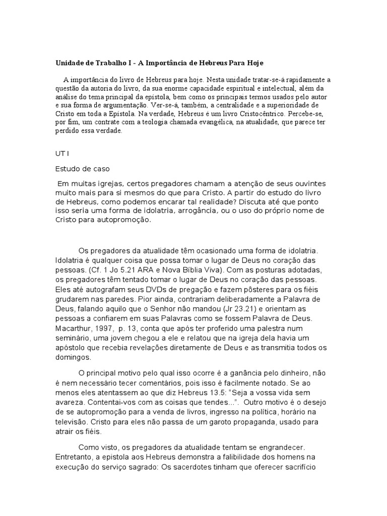 UT I Estudo de caso Em muitas igrejas, certos pregadores chamam a ateno de seus ouvintes muito mais para si mesmos do que para Cristo. A partir do estudo do livro de Hebreus, como podemos encarar tal realidade? Discuta at que ponto isso seria uma forma de idolatria, arrogncia, ou o uso do prprio nome de Cristo para autopromoo.