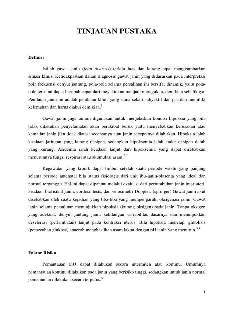 Definisi Istilah gawat janin (fetal distress) terlalu luas dan kurang tepat menggambarkan situasi klinis. Ketidakpastian dalam diagnosis gawat janin yang didasarkan pada interpretasi pola frekuensi denyut jantung, pola-pola selama persalinan ini bersifat dinamik, yaitu polapola tersebut dapat berubah cepat dari meyakinkan menjadi meragukan, demikian sebaliknya. Penilaian janin ini adalah penilaian klinis yang sama sekali subyektif dan pastilah memiliki kelemahan dan harus diakui demikian.1 Gawat janin juga umum digunakan untuk menjelaskan kondisi hipoksia yang bila tidak dilakukan penyelamatan akan berakibat buruk yaitu menyebabkan kerusakan atau kematian janin jika tidak diatasi secepatnya atau janin secepatnya dilahirkan. Hipoksia ialah keadaan jaringan yang kurang oksigen, sedangkan hipoksemia ialah kadar oksigen darah yang kurang. Asidemia ialah keadaan lanjut dari hipoksemia yang dapat disebabkan menurunnya fungsi respirasi atau akumulasi asam.2,3 Kegawatan yang kronik dapat timbul setelah suatu periode waktu yang panjang selama periode antenatal bila status fisiologis dari unit ibu-janin-plasenta yang ideal dan normal terganggu. Hal ini dapat dipantau melalui evaluasi dari pertumbuhan janin intar uteri, keadaan biofisikal janin, cordosintesis, dan velosimetri Doppler. (springer) Gawat janin akut disebabkan oleh suatu kejadian yang tiba-tiba yang mempengaruhi oksigenasi janin. Gawat janin selama persalinan menunjukkan hipoksia (kurang oksigen) pada janin. Tanpa oksigen yang adekuat, denyut jantung janin kehilangan variabilitas dasarnya dan menunjukkan deselerasi (perlambatan) lanjut pada kontraksi uterus. Bila hipoksia menetap, glikolisis (pemecahan glukosa) anaerob menghasilkan asam laktat dengan pH janin yang menurun.3,4