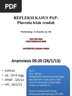 dari posisi terlentang ke posisi lateral sebagai usaha untuk membebaskan kompresi aortokaval dan memperbaiki aliran darah balik, curah jantung, dan aliran darah uteroplasental. Perubahan dalam posisi juga dapat membebaskan kompresi tali pusat. Oksigen diberikan melalui masker muka 6 liter per menit sebagai usaha untuk meningkatkan pergantian oksigen fetomaternal. Oksitosin dihentikan, karena kontraksi uterus akan mengganggu curahan darah ke ruang intervili. Hipotensi dikoreksi dengan infus intravena dekstrosa 5% dalam larutan Ringer Laktat. Transfusi darah dapat diindikasikan pada syok hemoragik. Pemeriksaan per vaginam menyingkirkan prolaps tali pusat dan menentukan perjalanan persalinan. Elevasi kepala janin secara lembut dapat merupakan suatu prosedur yang bermanfaat.1,3 Penatalaksanaan klinis perubahan pola frekuensi denyut jantung janin yang signifikan adalah, apabila mungkin, memperbaiki gangguan pada janin. Tindakan yang dianjurkan oleh American College of Obstetricians and Gynecologists (1998): 1) Reposisi pasien 2) Penghentian stimulant uterus dan koreksi hiperstimulasi uterus 3) Pemeriksaan dalam (vaginal touche) 4) Koreksi hipotensi ibu yang akibat analgesia regional 5) Pemberitahuan kepada staf anesthesia dan keperawatan akan perlunya persalinan darurat 6) Pemantauan frekuensi denyut jantung janin - dengan monitor janin elektronik atau auskultasi di ruang operasi sebelum persiapan abdomen 7) Meminta petugan terlatih untuk bersiap melakukan resusitasi dan perawatan neonates 8) Pemberian oksigen kepada ibu1 Mengubah posisi ibu menjadi lateral, memperbaiki hipotensi ibu akibat analgesia regional dan menghentikan oksitosin, berfungsi untuk memperbaiki perfusi uteroplasenta.5