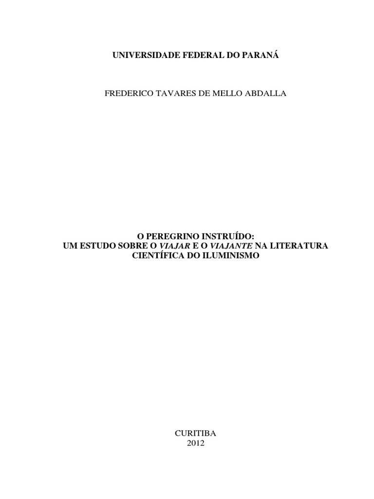 Abdalla, Frederico Tavares de Mello O peregrino instrudo: um estudo sobre o viajar e o viajante na literatura cientfica do iluminismo / Frederico Tavares de Mello Abdalla. Curitiba, 2012. 150 f.