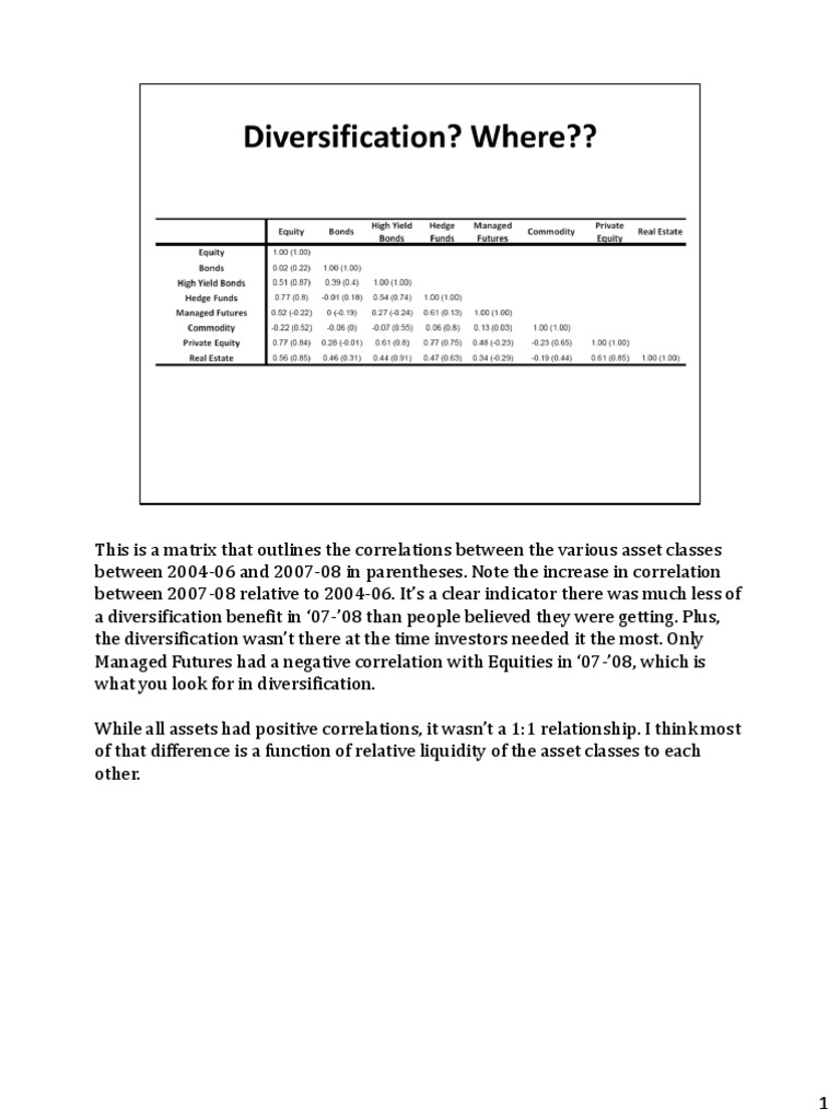 This is a matrix that outlines the correlations between the various asset classes between 2004-06 and 2007-08 in parentheses. Note the increase in correlation between 2007-08 relative to 2004-06. It’s a clear indicator there was much less of a diversification benefit in ‘07-’08 than people believed they were getting. Plus, the diversification wasn’t there at the time investors needed it the most. Only Managed Futures had a negative correlation with Equities in ‘07-’08, which is what you look for in diversification.