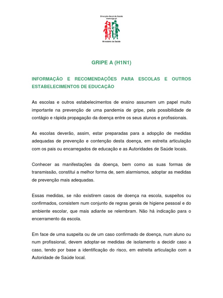 superior a 38.º C, ou sintomas de gripe não deve frequentar a escola, até