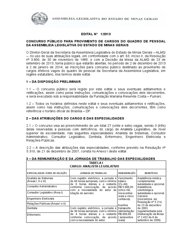 da Secretaria da Assembleia Legislativa do Estado de Minas Gerais ALMG , no uso de suas atribuies legais, em conformidade com o art. 63, inciso II, da Resoluo n 3.800, de 30 de novembro de 1985, e com a Deciso da Mesa da ALMG de 23 de setembro de 2013, torna pblico que estaro abertas, no perodo de 2 de dezembro de 2013 a 2 de janeiro de 2014, as inscries para concurso pblico destinado ao provimento de cargos efetivos vagos do quadro de pessoal da Secretaria da Assembleia Legislativa, em regime estatutrio, nos termos deste edital. 1 DA DISPOSIO PRELIMINAR 1.1 O concurso pblico ser regido por este edital e seus eventuais aditamentos e retificaes, assim como pelas instrues, comunicaes e convocaes dele decorrentes, e ser executado sob a responsabilidade da Fundao Mariana Resende Costa Fumarc. 1.2 Todos os horrios definidos neste edital e seus eventuais aditamentos e retificaes, assim como nas instrues, comunicaes e convocaes dele decorrentes, tm como referncia o horrio oficial de Braslia DF. 2 DAS ATRIBUIES DO CARGO E DAS ESPECIALIDADES 2.1 O concurso visa ao preenchimento de um total 27 (vinte e sete) vagas, sendo 3 (trs) delas reservadas a pessoas com deficincia, do cargo de Analista Legislativo, de nvel superior de escolaridade, nas seguintes especialidades: Analista de Sistemas, Consultor Administrativo, Consultor Legislativo, Dentista, Enfermeiro, Engenheiro Eletricista e Relaes-Pblicas. 2.2 A descrio das atribuies das especialidades, conforme previsto na Resoluo n 5.310, de 21 de dezembro de 2007, consta no Anexo I deste edital. 3 DA REMUNERAO E DA JORNADA DE TRABALHO DAS ESPECIALIDADES