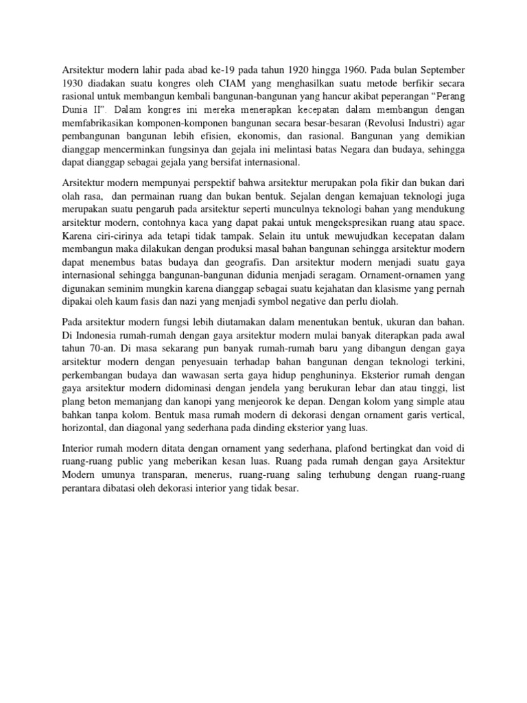 Pada bulan September 1930 diadakan suatu kongres oleh CIAM yang menghasilkan suatu metode berfikir secara rasional untuk membangun kembali bangunan-bangunan yang hancur akibat peperangan Perang Dunia II. Dalam kongres ini mereka menerapkan kecepatan dalam membangun dengan memfabrikasikan komponen-komponen bangunan secara besar-besaran (Revolusi Industri) agar pembangunan bangunan lebih efisien, ekonomis, dan rasional. Bangunan yang demikian dianggap mencerminkan fungsinya dan gejala ini melintasi batas Negara dan budaya, sehingga dapat dianggap sebagai gejala yang bersifat internasional. Arsitektur modern mempunyai perspektif bahwa arsitektur merupakan pola fikir dan bukan dari olah rasa, dan permainan ruang dan bukan bentuk. Sejalan dengan kemajuan teknologi juga merupakan suatu pengaruh pada arsitektur seperti munculnya teknologi bahan yang mendukung arsitektur modern, contohnya kaca yang dapat pakai untuk mengekspresikan ruang atau space. Karena ciri-cirinya ada tetapi tidak tampak. Selain itu untuk mewujudkan kecepatan dalam membangun maka dilakukan dengan produksi masal bahan bangunan sehingga arsitektur modern dapat menembus batas budaya dan geografis. Dan arsitektur modern menjadi suatu gaya internasional sehingga bangunan-bangunan didunia menjadi seragam. Ornament-ornamen yang digunakan seminim mungkin karena dianggap sebagai suatu kejahatan dan klasisme yang pernah dipakai oleh kaum fasis dan nazi yang menjadi symbol negative dan perlu diolah. Pada arsitektur modern fungsi lebih diutamakan dalam menentukan bentuk, ukuran dan bahan. Di Indonesia rumah-rumah dengan gaya arsitektur modern mulai banyak diterapkan pada awal tahun 70-an. Di masa sekarang pun banyak rumah-rumah baru yang dibangun dengan gaya arsitektur modern dengan penyesuain terhadap bahan bangunan dengan teknologi terkini, perkembangan budaya dan wawasan serta gaya hidup penghuninya. Eksterior rumah dengan gaya arsitektur modern didominasi dengan jendela yang berukuran lebar dan atau tinggi, list plang beton memanjang dan kanopi yang menjeorok ke depan. Dengan kolom yang simple atau bahkan tanpa kolom. Bentuk masa rumah modern di dekorasi dengan ornament garis vertical, horizontal, dan diagonal yang sederhana pada dinding eksterior yang luas. Interior rumah modern ditata dengan ornament yang sederhana, plafond bertingkat dan void di ruang-ruang public yang meberikan kesan luas. Ruang pada rumah dengan gaya Arsitektur Modern umunya transparan, menerus, ruang-ruang saling terhubung dengan ruang-ruang perantara dibatasi oleh dekorasi interior yang tidak besar.