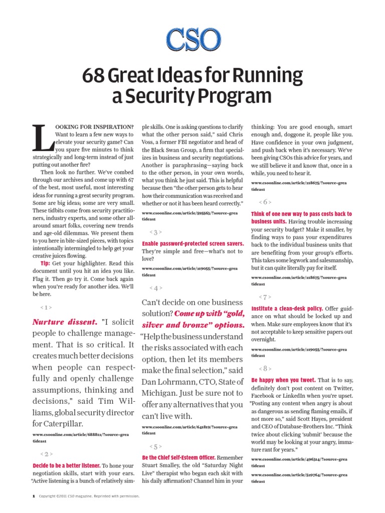 ooking for inspiration? Want to learn a few new ways to elevate your security game? Can you spare five minutes to think strategically and long-term instead of just putting out another fire? Then look no further. Weve combed through our archives and come up with 67 of the best, most useful, most interesting ideas for running a great security program. Some are big ideas; some are very small. These tidbits come from security practitioners, industry experts, and some other allaround smart folks, covering new trends and age-old dilemmas. We present them to you here in bite-sized pieces, with topics intentionally intermingled to help get your creative juices flowing. Tip: Get your highlighter. Read this document until you hit an idea you like. Flag it. Then go try it. Come back again when you're ready for another idea. Well be here.