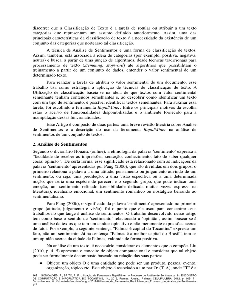 GONALVES, R., BRITO, P. F. Utilizao da Ferramenta RapidMiner no Processo de Anlise de Sentimentos. In: ENCONTRO DE COMPUTAO E INFORMTICA DO TOCANTINS, 14., 2012, Palmas. Anais... Palmas: CEULP/ULBRA, 2012. p. 162-171. Disponvel em http://ulbra-to.br/encoinfo/artigos/2012/Utilizacao_da_Ferramenta_RapidMiner_no_Processo_de_Analise_de_Sentimentos.pdf. 163