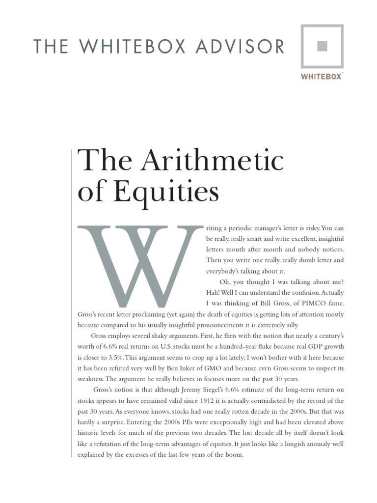 Gross’s recent letter proclaiming (yet again) the death of equities is getting lots of attention mostly because compared to his usually insightful pronouncements it is extremely silly. Gross employs several shaky arguments. First, he irts with the notion that nearly a century’s worth of 6.6% real returns on U.S. stocks must be a hundred-year uke because real GDP growth is closer to 3.5%.This argument seems to crop up a lot lately; I won’t bother with it here because it has been refuted very well by Ben Inker of GMO and because even Gross seems to suspect its weakness.The argument he really believes in focuses more on the past 30 years. Gross’s notion is that although Jeremy Siegel’s 6.6% estimate of the long-term return on stocks appears to have remained valid since 1912 it is actually contradicted by the record of the past 30 years. As everyone knows, stocks had one really rotten decade in the 2000s. But that was