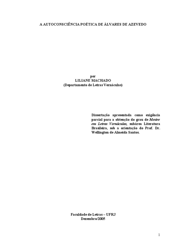 EXAME DE DISSERTAO MACHADO, Liliane. A Autoconscincia Potica de lvares de Azevedo. Orientador: Wellington de Almeida Santos. Rio de Janeiro: UFRJ / Faculdade de Letras, 2006. Dissertao de Mestrado em Literatura Brasileira. BANCA EXAMINADORA
