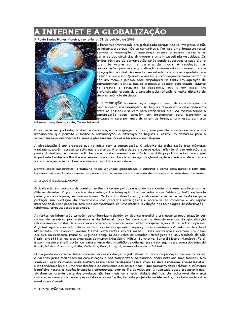 Antonio Eudes Nunes Moreira, sexta-feira, 31 de outubro de 2008 O homem primitivo no era globalizado porque no se integrava, e no se integrava porque no se comunicava. Por isso uma lngua universal permite a integrao. A tecnologia avana a passos largos e as barreiras das distncias diminuem a uma insuspeitada velocidade. Os limites tcnicos de comunicao esto sendo superados a cada dia, o que no ocorre com a barreira da lngua. A revoluo nas comunicaes promove a globalizao e representa um avano para a integrao mundial. Apresenta, entretanto, como contrapartida, um desafio e um risco. Quando o acesso informao se torna um fim e no um meio, a pessoa pode empobrecer-se tanto em aquisio de conhecimento, cincia, que s possvel adquirir pelo estudo, quanto na procura e conquista da sabedoria, que um saber em profundidade, essencial, alcanado pela reflexo e muito distante do simples acmulo de dados. 1. INTRODUO A comunicao exige um meio de comunicao. No caso humano a linguagem. As lnguas favorecem o relacionamento entre as pessoas e servem para estabelecer elos. Ao mesmo tempo a comunicao exige tambm um instrumento para transmitir a linguagem, seja por meio de sinais de fumaa, luminosos, com alto falantes, megafones, rdio, TV ou Internet. Duas barreiras, portanto, limitam a comunicao: a linguagem comum, que permite a compreenso, e um instrumento que permita e facilite a comunicao. A diferena de lnguas assim um obstculo para a comunicao e, indiretamente, para a globalizao. A outra barreira tecnolgica. A globalizao um processo que se inicia com a comunicao. O advento da globalizao traz inmeras vantagens, porm apresenta sofismas e desafios. A anlise desse processo exige reflexo. A comunicao e a ponta do iceberg. A comunicao favorece o relacionamento econmico, o dilogo poltico e tem um papel importante tambm cultural e em termos de valores. Para ir ao mago da globalizao preciso analisar no s a comunicao, mas tambm a economia, a poltica e os valores. Dentre esses parmetros, o trabalho relata a juno globalizao x Internet e como essa parceria tem sido fundamental para todas as reas da nossa vida, tal como para a evoluo do homem como sociedade e mundo. 2. O QUE GLOBALIZAO? Globalizao o conjunto de transformaes na ordem poltica e econmica mundial que vem acontecendo nas ltimas dcadas. O ponto central da mudana a integrao dos mercados numa "aldeia-global", explorada pelas grandes corporaes internacionais. Os Estados abandonam gradativamente as barreiras tarifrias para proteger sua produo da concorrncia dos produtos estrangeiros e abrem-se ao comrcio e ao capital internacional. Esse processo tem sido acompanhado de uma intensa revoluo nas tecnologias de informao telefones, computadores e televiso. As fontes de informao tambm se uniformizam devido ao alcance mundial e crescente popularizao dos canais de televiso por assinatura e da Internet. Isso faz com que os desdobramentos da globalizao ultrapassem os limites da economia e comecem a provocar uma certa homogeneizao cultural entre os pases. A globalizao marcada pela expanso mundial das grandes corporaes internacionais. A cadeia de fast food McDonalds, por exemplo, possui 18 mil restaurantes em 91 pases. Essas corporaes exercem um papel decisivo na economia mundial. Segundo pesquisa do Ncleo de Estudos Estratgicos da Universidade de So Paulo, em 1994 as maiores empresas do mundo (Mitsubishi, Mitsui, Sumitomo, General Motors, Marubeni, Ford, Exxon, Nissho e Shell) obtm um faturamento de 1,4 trilho de dlares. Esse valor equivale soma dos PIBs do Brasil, Mxico, Argentina, Chile, Colmbia, Peru, Uruguai, Venezuela e Nova Zelndia. Outro ponto importante desse processo so as mudanas significativas no modo de produo das mercadorias. Auxiliadas pelas facilidades na comunicao e nos transportes, as transnacionais instalam suas fbricas sem qualquer lugar do mundo onde existam as melhores vantagens fiscais, mo-de-obra e matrias-primas baratas. Essa tendncia leva a uma transferncia de empregos dos pases ricos - que possuem altos salrios e inmeros benefcios - para as naes industriais emergentes, com os Tigres Asiticos. O resultado desse processo que, atualmente, grande parte dos produtos no tem mais uma nacionalidade definida. Um automvel de marca norte-americana pode conter peas fabricadas no Japo, ter sido projetado na Alemanha, montado no Brasil e vendido no Canad. 3. A EVOLUO DA INTERNET
