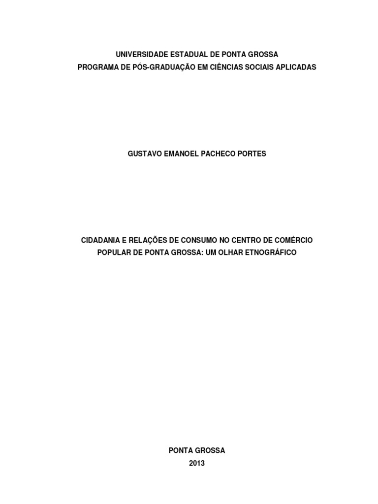 tendo como objeto de pesquisa o Centro de Comrcio Popular de Ponta Grossa (CCP) PR, popularmente denominado Paraguaizinho1. Esta dissertao constitui, portanto, a apresentao de uma pesquisa qualitativa realizada em Cincias Sociais com o fim de explorar esta questo epicntrica: relaes entre consumo e cidadania em um mercado popular. Podemos melhor descrev-la como uma investigao fenomenolgica, uma busca pela cincia da essncia da problemtica. Nesta pesquisa, o objeto emprico demandou a apropriao de instrumentalidades terico-metodolgicas que, de forma mais precisa quanto possvel, lograssem alcanar respostas s indagaes. O Programa de Ps-Graduao em Cincias Sociais Aplicadas da Universidade Estadual de Ponta Grossa (UEPG) privilegia a abordagem
