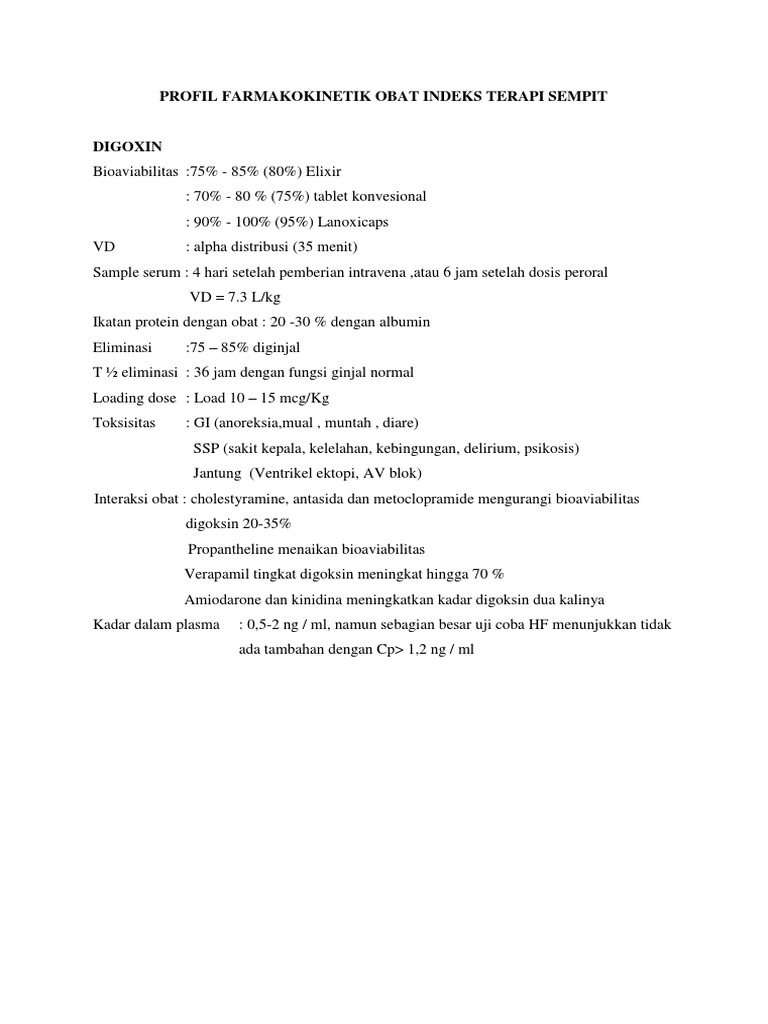 DIGOXIN Bioaviabilitas :75% - 85% (80%) Elixir : 70% - 80 % (75%) tablet konvesional : 90% - 100% (95%) Lanoxicaps VD : alpha distribusi (35 menit)