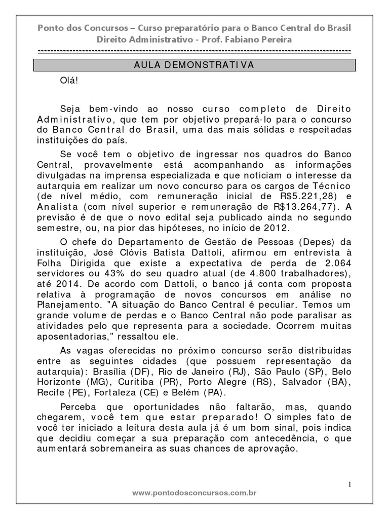AULA DEMONSTRATIVA Ol! Seja bem-vindo ao nosso curso completo de Direito Administrativo, que tem por objetivo prepar-lo para o concurso do Banco Central do Brasil, uma das mais slidas e respeitadas instituies do pas. Se voc tem o objetivo de ingressar nos quadros do Banco Central, provavelmente est acompanhando as informaes divulgadas na imprensa especializada e que noticiam o interesse da autarquia em realizar um novo concurso para os cargos de Tcnico (de nvel mdio, com remunerao inicial de R$5.221,28) e Analista (com nvel superior e remunerao de R$13.264,77). A previso de que o novo edital seja publicado ainda no segundo semestre, ou, na pior das hipteses, no incio de 2012. O chefe do Departamento de Gesto de Pessoas (Depes) da instituio, Jos Clvis Batista Dattoli, afirmou em entrevista Folha Dirigida que existe a expectativa de perda de 2.064 servidores ou 43% do seu quadro atual (de 4.800 trabalhadores), at 2014. De acordo com Dattoli, o banco j conta com proposta relativa programao de novos concursos em anlise no Planejamento. "A situao do Banco Central peculiar. Temos um grande volume de perdas e o Banco Central no pode paralisar as atividades pelo que representa para a sociedade. Ocorrem muitas aposentadorias," ressaltou ele. As vagas oferecidas no prximo concurso sero distribudas entre as seguintes cidades (que possuem representao da autarquia): Braslia (DF), Rio de Janeiro (RJ), So Paulo (SP), Belo Horizonte (MG), Curitiba (PR), Porto Alegre (RS), Salvador (BA), Recife (PE), Fortaleza (CE) e Belm (PA). Perceba que oportunidades no faltaro, mas, quando chegarem, voc tem que estar preparado! O simples fato de voc ter iniciado a leitura desta aula j um bom sinal, pois indica que decidiu comear a sua preparao com antecedncia, o que aumentar sobremaneira as suas chances de aprovao.