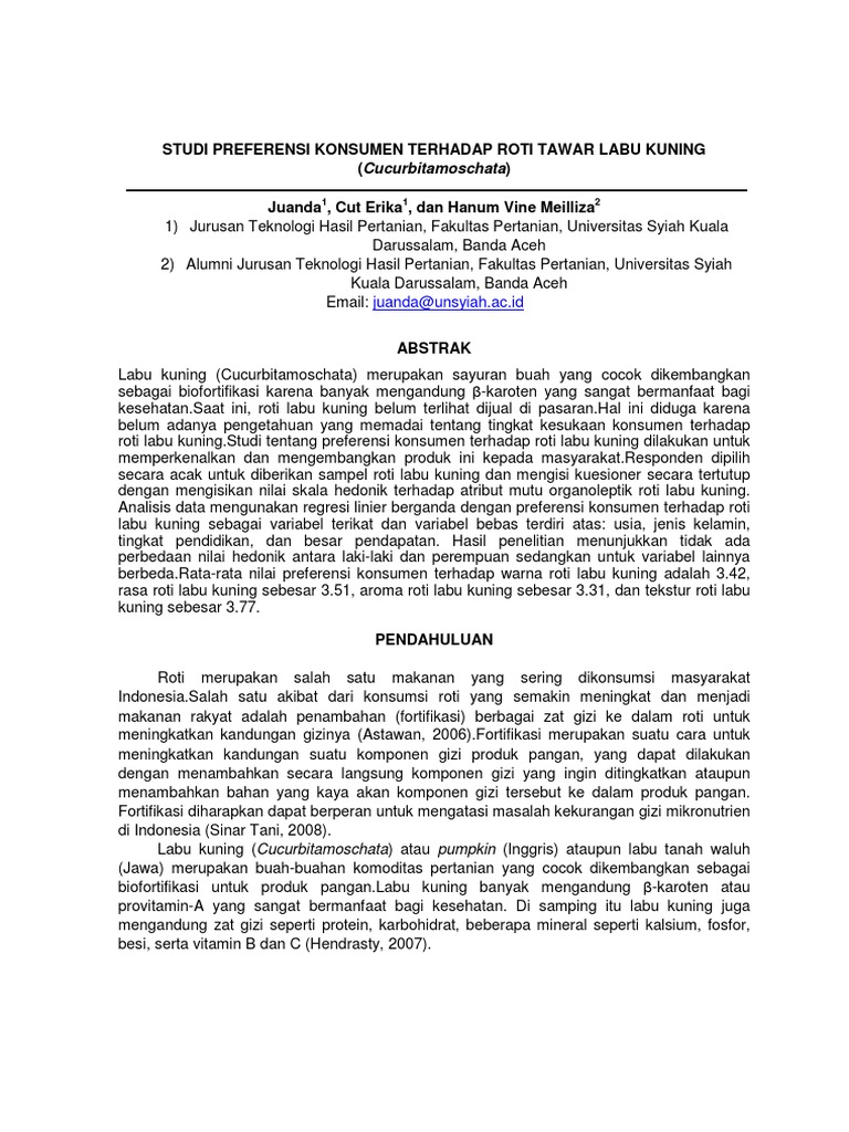 Meilliza2 1) Jurusan Teknologi Hasil Pertanian, Fakultas Pertanian, Universitas Syiah Kuala Darussalam, Banda Aceh 2) Alumni Jurusan Teknologi Hasil Pertanian, Fakultas Pertanian, Universitas Syiah Kuala Darussalam, Banda Aceh Email: juanda@unsyiah.ac.id ABSTRAK Labu kuning (Cucurbitamoschata) merupakan sayuran buah yang cocok dikembangkan sebagai biofortifikasi karena banyak mengandung -karoten yang sangat bermanfaat bagi kesehatan.Saat ini, roti labu kuning belum terlihat dijual di pasaran.Hal ini diduga karena belum adanya pengetahuan yang memadai tentang tingkat kesukaan konsumen terhadap roti labu kuning.Studi tentang preferensi konsumen terhadap roti labu kuning dilakukan untuk memperkenalkan dan mengembangkan produk ini kepada masyarakat.Responden dipilih secara acak untuk diberikan sampel roti labu kuning dan mengisi kuesioner secara tertutup dengan mengisikan nilai skala hedonik terhadap atribut mutu organoleptik roti labu kuning. Analisis data mengunakan regresi linier berganda dengan preferensi konsumen terhadap roti labu kuning sebagai variabel terikat dan variabel bebas terdiri atas: usia, jenis kelamin, tingkat pendidikan, dan besar pendapatan. Hasil penelitian menunjukkan tidak ada perbedaan nilai hedonik antara laki-laki dan perempuan sedangkan untuk variabel lainnya berbeda.Rata-rata nilai preferensi konsumen terhadap warna roti labu kuning adalah 3.42, rasa roti labu kuning sebesar 3.51, aroma roti labu kuning sebesar 3.31, dan tekstur roti labu kuning sebesar 3.77. PENDAHULUAN Roti merupakan salah satu makanan yang sering dikonsumsi masyarakat Indonesia.Salah satu akibat dari konsumsi roti yang semakin meningkat dan menjadi makanan rakyat adalah penambahan (fortifikasi) berbagai zat gizi ke dalam roti untuk meningkatkan kandungan gizinya (Astawan, 2006).Fortifikasi merupakan suatu cara untuk meningkatkan kandungan suatu komponen gizi produk pangan, yang dapat dilakukan dengan menambahkan secara langsung komponen gizi yang ingin ditingkatkan ataupun menambahkan bahan yang kaya akan komponen gizi tersebut ke dalam produk pangan. Fortifikasi diharapkan dapat berperan untuk mengatasi masalah kekurangan gizi mikronutrien di Indonesia (Sinar Tani, 2008). Labu kuning (Cucurbitamoschata) atau pumpkin (Inggris) ataupun labu tanah waluh (Jawa) merupakan buah-buahan komoditas pertanian yang cocok dikembangkan sebagai biofortifikasi untuk produk pangan.Labu kuning banyak mengandung -karoten atau provitamin-A yang sangat bermanfaat bagi kesehatan. Di samping itu labu kuning juga mengandung zat gizi seperti protein, karbohidrat, beberapa mineral seperti kalsium, fosfor, besi, serta vitamin B dan C (Hendrasty, 2007).