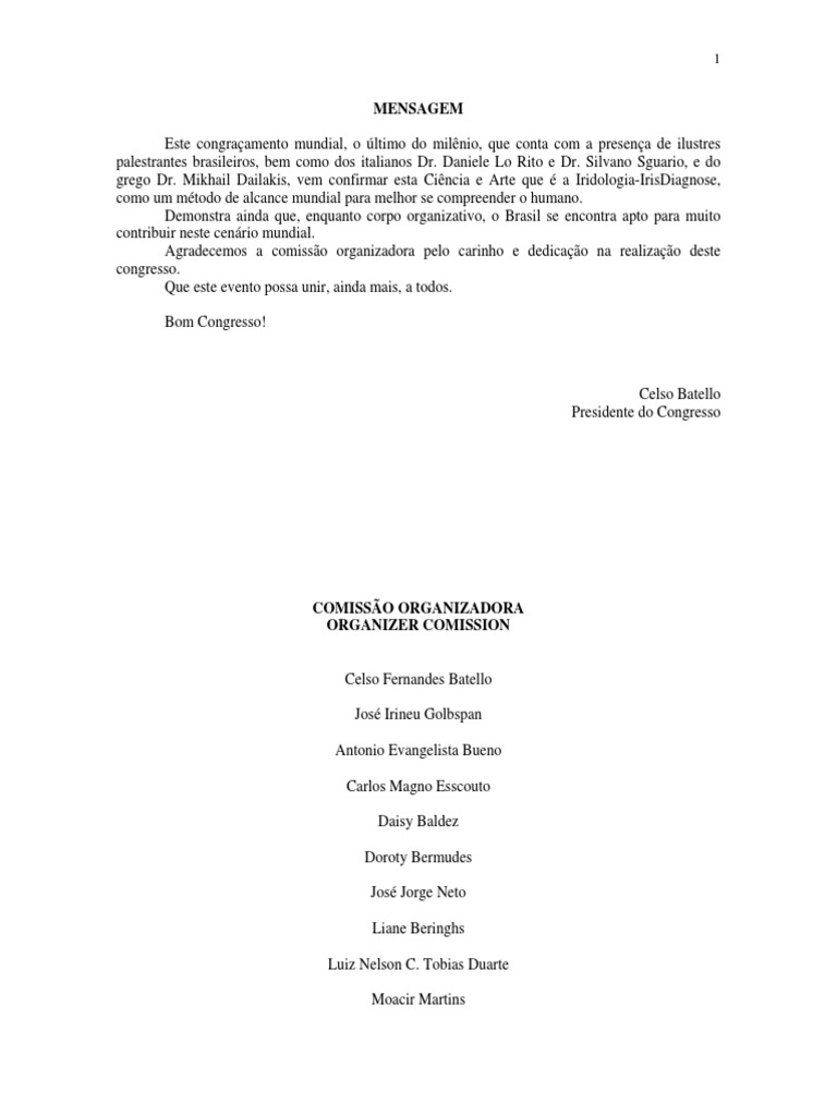 Este congraçamento mundial, o último do milênio, que conta com a presença de ilustres palestrantes brasileiros, bem como dos italianos Dr. Daniele Lo Rito e Dr. Silvano Sguario, e do grego Dr. Mikhail Dailakis, vem confirmar esta Ciência e Arte que é a Iridologia-IrisDiagnose, como um método de alcance mundial para melhor se compreender o humano. Demonstra ainda que, enquanto corpo organizativo, o Brasil se encontra apto para muito contribuir neste cenário mundial. Agradecemos a comissão organizadora pelo carinho e dedicação na realização deste congresso. Que este evento possa unir, ainda mais, a todos.