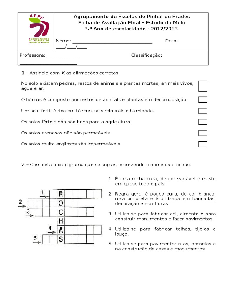 ! Ano de escolaridade - 2"12#2"13 Nome: %%%%%%%%%%%%%%%%%%%%%%%%%%%%%%%%%%% %%%%'%%%%'%%%% (rofessora:%%%%%%%%%%%%%%%% %%%%%%%%%%%%%%%%%%%%%%%%% 1 - Assinala com X as afirmaes corretas: No solo existem pedras, restos de animais e plantas mortas, animais vivos, gua e ar. O hmus composto por restos de animais e plantas em decomposi o. !m solo frtil rico em hmus, sais minerais e humidade. Os solos frteis n o s o "ons para a agricultura. Os solos arenosos n o s o permeveis. Os solos muito argilosos s o impermeveis. #lassifica o: &ata: