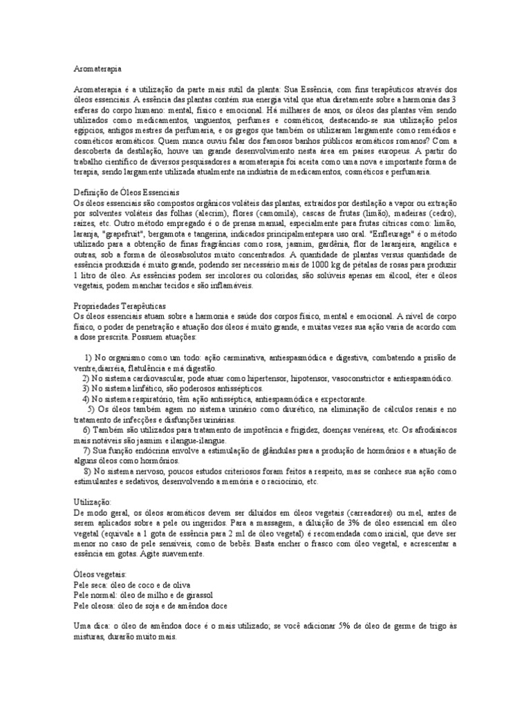 s essenciais. A essncia das plantas contm sua energia vital que atua diretamente so re a !armonia das " esferas do corpo !umano: mental, f#sico e emocional. $% mil!ares de anos, os leos das plantas vm sendo utilizados como medicamentos, unguentos, perfumes e cosmticos, destacando&se sua utilizao pelos eg#pcios, antigos mestres da perfumaria, e os gregos que tam m os utilizaram largamente como remdios e cosmticos arom%ticos. 'uem nunca ouviu falar dos famosos an!os p( licos arom%ticos romanos) *om a desco erta da destilao, !ouve um grande desenvolvimento nesta %rea em pa#ses europeus. A partir do tra al!o cient#fico de diversos pesquisadores a aromaterapia foi aceita como uma nova e importante forma de terapia, sendo largamente utilizada atualmente na ind(stria de medicamentos, cosmticos e perfumaria. +efinio de ,leos Essenciais -s leos essenciais so compostos org.nicos vol%teis das plantas, e/tra#dos por destilao a vapor ou e/trao por solventes vol%teis das fol!as 0alecrim1, flores 0camomila1, cascas de frutas 0limo1, madeiras 0cedro1, ra#zes, etc. -utro mtodo empregado o de prensa manual, especialmente para frutas c#tricas como: limo, laran2a, 3grapefruit3, ergamota e tangerina, indicados principalmentepara uso oral. 3Enfleurage3 o mtodo utilizado para a o teno de finas fragr.ncias como rosa, 2asmim, gardnia, flor de laran2eira, anglica e outras, so a forma de leosa solutos muito concentrados. A quantidade de plantas versus quantidade de essncia produzida muito grande, podendo ser necess%rio mais de 4555 6g de ptalas de rosas para produzir 4 litro de leo. As essncias podem ser incolores ou coloridas, so sol(veis apenas em %lcool, ter e leos vegetais, podem manc!ar tecidos e so inflam%veis. 7ropriedades 8eraputicas -s leos essenciais atuam so re a !armonia e sa(de dos corpos f#sico, mental e emocional. A n#vel de corpo f#sico, o poder de penetrao e atuao dos leos muito grande, e muitas vezes sua ao varia de acordo com a dose prescrita. 7ossuem atua9es: 41 :o organismo como um todo: ao carminativa, antiespasmdica e digestiva, com atendo a priso de ventre,diarria, flatulncia e m% digesto. ;1 :o sistema cardiovascular, pode atuar como !ipertensor, !ipotensor, vasoconstrictor e antiespasmdico. "1 :o sistema linf%tico, so poderosos antisspticos. <1 :o sistema respiratrio, tm ao antissptica, antiespasmdica e e/pectorante. =1 -s leos tam m agem no sistema urin%rio como diurtico, na eliminao de c%lculos renais e no tratamento de infec9es e disfun9es urin%rias. >1 8am m so utilizados para tratamento de impotncia e frigidez, doenas venreas, etc. -s afrodis#acos mais not%veis so 2asmim e ilangue&ilangue. ?1 Sua funo endcrina envolve a estimulao de gl.ndulas para a produo de !orm@nios e a atuao de alguns leos como !orm@nios. A1 :o sistema nervoso, poucos estudos criteriosos foram feitos a respeito, mas se con!ece sua ao como estimulantes e sedativos, desenvolvendo a memria e o racioc#nio, etc. Btilizao: +e modo geral, os leos arom%ticos devem ser dilu#dos em leos vegetais 0carreadores1 ou mel, antes de serem aplicados so re a pele ou ingeridos. 7ara a massagem, a diluio de "C de leo essencial em leo vegetal 0equivale a 4 gota de essncia para ; ml de leo vegetal1 recomendada como inicial, que deve ser menor no caso de pele sens#veis, como de e s. Dasta enc!er o frasco com leo vegetal, e acrescentar a essncia em gotas. Agite suavemente. ,leos vegetais: 7ele seca: leo de coco e de oliva 7ele normal: leo de mil!o e de girassol 7ele oleosa: leo de so2a e de amndoa doce Bma dica: o leo de amndoa doce o mais utilizadoE se voc adicionar =C de leo de germe de trigo Fs misturas, duraro muito mais.
