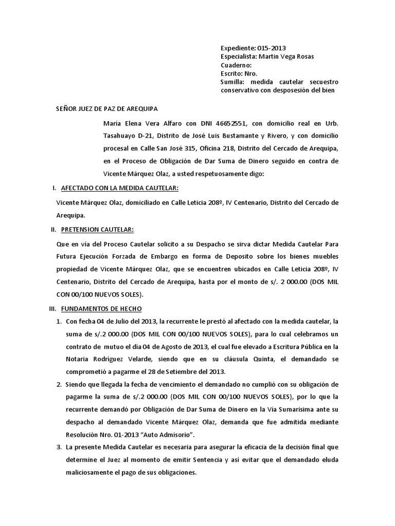 Sumilla: medida cautelar secuestro conservativo con desposesión del bien SEÑOR JUEZ DE PAZ DE AREQUIPA María Elena Vera Alfaro con DNI 46652551, con domicilio real en Urb. Tasahuayo D-21, Distrito de José Luis Bustamante y Rivero, y con domicilio procesal en Calle San José 315, Oficina 218, Distrito del Cercado de Arequipa, en el Proceso de Obligación de Dar Suma de Dinero seguido en contra de Vicente Márquez Olaz, a usted respetuosamente digo: I. AFECTADO CON LA MEDIDA CAUTELAR: Vicente Márquez Olaz, domiciliado en Calle Leticia 208º, IV Centenario, Distrito del Cercado de Arequipa. II. PRETENSION CAUTELAR: Que en vía del Proceso Cautelar solicito a su Despacho se sirva dictar Medida Cautelar Para Futura Ejecución Forzada de Embargo en forma de Deposito sobre los bienes muebles propiedad de Vicente Márquez Olaz, que se encuentren ubicados en Calle Leticia 208º, IV Centenario, Distrito del Cercado de Arequipa, hasta por el monto de s/. 2 000.00 (DOS MIL CON 00/100 NUEVOS SOLES). III. FUNDAMENTOS DE HECHO 1. Con fecha 04 de Julio del 2013, la recurrente le prestó al afectado con la medida cautelar, la suma de s/.2 000.00 (DOS MIL CON 00/100 NUEVOS SOLES), para lo cual celebramos un contrato de mutuo el día 04 de Agosto de 2013, el cual fue elevado a Escritura Pública en la Notaria Rodríguez Velarde, siendo que en su cláusula Quinta, el demandado se comprometió a pagarme el 28 de Setiembre del 2013. 2. Siendo que llegada la fecha de vencimiento el demandado no cumplió con su obligación de pagarme la suma de s/.2 000.00 (DOS MIL CON 00/100 NUEVOS SOLES), por lo que la recurrente demandó por Obligación de Dar Suma de Dinero en la Vía Sumarísima ante su despacho al demandado Vicente Márquez Olaz, demanda que fue admitida mediante Resolución Nro. 01-2013 “Auto Admisorio”. 3. La presente Medida Cautelar es necesaria para asegurar la eficacia de la decisión final que determine el Juez al momento de emitir Sentencia y así evitar que el demandado eluda maliciosamente el pago de sus obligaciones.