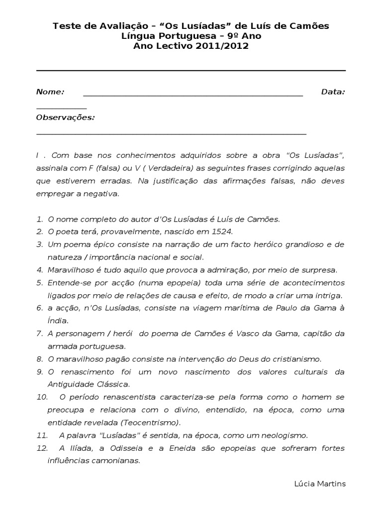 _____________ Observaes: ______________________________________________________________________ I . Com base nos conhecimentos adquiridos sobre a obra Os Lusadas, assinala com F (falsa) ou V ( Verdadeira) as se uintes frases corri indo aquelas que esti!erem erradas. "a #ustifica$%o das afirma$&es falsas, n%o de!es em're ar a ne ati!a. (. O nome com'leto do autor d)Os Lusadas * Lus de Cam&es. +. O 'oeta ter,, 'ro!a!elmente, nascido em (-+.. /. 0m 'oema *'ico consiste na narra$%o de um facto her1ico nature2a 3 im'ort4ncia nacional e social. .. 5ara!ilhoso * tudo aquilo que 'ro!oca a admira$%o, 'or meio de sur'resa. -. 6ntende7se 'or ac$%o (numa e'o'eia) toda uma s*rie de acontecimentos li ados 'or meio de rela$&es de causa e efeito, de modo a criar uma intri a. 8. a ac$%o, n)Os Lusadas, consiste na !ia em martima de 9aulo da :ama ; <ndia. =. > 'ersona em 3 her1i do 'oema de Cam&es * Vasco da :ama, ca'it%o da armada 'ortu uesa. ?. O mara!ilhoso 'a %o consiste na inter!en$%o do @eus do cristianismo. A. O renascimento foi um no!o nascimento dos !alores culturais da >nti uidade Cl,ssica. (B. O 'erodo renascentista caracteri2a7se 'ela forma como o homem se 'reocu'a e relaciona com o di!ino, entendido, na *'oca, como uma entidade re!elada (Ceocentrismo). ((. (+. > 'ala!ra Lusadas * sentida, na *'oca, como um neolo ismo. > Ilada, a Odisseia e a 6neida s%o e'o'eias que sofreram fortes randioso e de