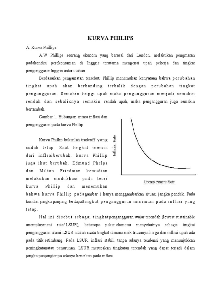 A. Kurva Phillips A.W Phillips seorang ekonom yang berasal dari London, melakukan pengmatan padakondisi perekonomian di Inggris terutama mengenai upah pekerja dan tingkat pengangguranInggris antara tahun. Berdasarkan pengamatan tersebut, Phillip menemukan kenyataan bahwa p e r u b a h a n tingkat upah akan berbanding terbalik dengan perubahan tingkat pengangguran. bertambah. !ambar ". #ubungan antara in$lasi dan pengangguran pada kurva Phillip Kurva Phillip bukanlah tradeo$$ y a n g sudah tetap. aat tingkat inersia dari in$lsaiberubah, kurva Phillip juga ikut berubah. %dmund Phelps dan kurva &ilton Phillip 'riedman modi$ikasi dan kemudian pada teori menemukan melakukan emakin tinggi upah maka pengangguran menjadi semakin