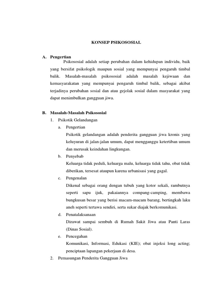 A. Pengertian Psikososial adalah setiap perubahan dalam kehidupan individu, baik yang bersifat psikologik maupun sosial yang mempunyai pengaruh timbal balik. Masalah-masalah psikososial adalah masalah kejiwaan dan