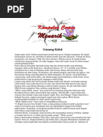 membacanya terdengar seratus kali lebih menarik dari jika dibacakan oleh Pak Lebai. Tetapi itu dahulu. Entahlah kini. Telah lama Buyung tak mendengar Zaitun menyanyi. Pernah juga Buyung mendengar Zaitun menyanyi di pancuran bersama dengan kawankawannya. Mereka menyanyikan lagu sedih, lagu seseorang yang rindu pada kekasihnya yang pergi jauh merantau,dan bertanya-lanya apabitakah kekasihnya yang dirindukannya akan pulang ke kampung. Hampir saja Buyung ke luar dari tempat persembunyiannya, begitu inginnya dia hendak mendengarkan lagu Zaitun dari dekat. Akan letapi dia menahan dirinya kuatkuat, karena teringat apa kata orang sekampung, jika dia ketahuan mengintip gadis-gadis yang sedang mandi? Aduh, alangkah malunya .... dan dia akan ditertawakan dan diolokolokkan oleh seluruh kampung. Dalam hatinya Buyung amat ingin lekas menjadi lebih dewasa dan letaki yang matang, seperti kawan-kawannya yang lain. Umpamanya Sutan, yang lebih pandai bersilat dari dia, meskipun mereka sama-sama murid Wak Katok, yang telah menikah, dan amat pandainya bergaul dengan perempuan, tua atau muda, dan yang pandai pula bekerja mencari uang. Dia bersawah, berladang, mengambil rotan dan damar, dan kadang-kadang dia berdagang pula, berjual beli kambing atau lembu. Yang paling senang kiranya orang seperti Sanip, pikirnya. Sanip penggembira sekali. Sanip selalu membawa sebuah dangung-dangung dalam saku bajunya. Dan setiap ada kesempatan, maka keluarlah dangung-dangung, dipasangnya ke mulutnya, dan dia pun memainkan segala macam lagu. Pandai benar dia memainkan dangung-dangung. Dapat saja disuruhnya dangung-dangung menyanyi, sekali lagu gembira, sekali lagu sedih, dan merataplah dangung-dangung... Jika mereka sedang duduk di sekeliling api unggun di tengah