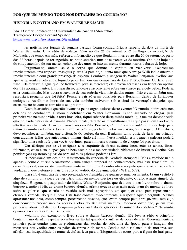 HISTRIA E COTIDIANO EM WALTER BENJAMIN Klaus Garber - professor da Universidade de Aachen (Alemanha). Traduo de George Bernard Sperber http://www.usp.br/revistausp/n15/jean.html As notcias nos jornais da semana passada foram contraditrias a respeito da data da morte de Walter Benjamin. Uma srie de colegas falou no dia 27 de setembro. O catlogo da exposio de Marbach, que temos em mo, refora a informao de que Benjamin morreu no dia 26 de setembro, perto das 22 horas, depois de ter ingerido, na noite anterior, uma dose excessiva de morfina. O dia de hoje o do cinqentenrio de sua morte. Acho que devemos ter isto em mente durante nossos debates de hoje. Perguntou-se, ontem, se o corpo que domina o esprito ou vice-versa. Ocorreu-me imediatamente uma resposta, mas quis guard-la para hoje - tanto mais que o amigo Willi Bolle interveio imediatamente e com grande presena de esprito. Lembrem a imagem de Walter Benjamin, "velho" aos apenas quarenta e oito anos, fugindo pelos Pirineus em companhia de Lisa Fittko, Henny Gurland e seu filho. Ele recusou a gua que lhe trouxeram para se refrescar; ela deveria ser usada em benefcio apenas dos trs acompanhantes. Em lugar disso, lanou-se inconsciente sobre um charco para dele beber. Poderia estar contaminado. Mas agora tratava-se de sua prpria vida, no da dos outros. No esta tambm uma resposta pergunta que foi feita? Pensar e agir s eram possveis para Benjamin dentro de horizontes teolgicos. As ltimas horas de sua vida tambm estiveram sob o sinal da venerao daqueles que casualmente haviam-se tornado o seu prximo. Devo falar sobre a questo levantada pelos organizadores deste evento: "O mundo inteiro cabe nos detalhes do cotidiano?" Histria e cotidiano em Walter Benjamin. Tendo acabado de chegar, pela primeira vez na minha vida, terra brasileira, fiquei sabendo desta minha tarefa, que me era desconhecida quando ainda estava na Alemanha. Naturalmente, durante os maravilhosos dias que passei em So Paulo, no tive oportunidade de me preparar para esta fala. Portanto, s me ficou a manh do dia de hoje para reunir as minhas reflexes. Peo desculpas prvias, portanto, pelas improvisaes a seguir. Alm disso, devo reconhecer, tambm, que a situao do perigo, da qual Benjamin tanto gosta de falar, me brindou com algumas idias que antes nunca tinham vindo at mim. Nesta medida, esta pequena palestra poder significar uma catstrofe para vocs, ouvintes; para mim este tratamento de choque foi proveitoso. Um fillogo que se v obrigado a se exprimir de forma sucinta lana mo de textos. Estes, felizmente, esto sua disposio na bem escolhida e melhor cuidada biblioteca do Instituto Goethe. Nas ponderaes epistemolgicas da obra sobre as galerias podemos ler: " necessrio um decidido afastamento do conceito da 'verdade atemporal'. Mas a verdade no apenas - como o afirma o marxismo - uma funo temporal do conhecimento, mas est fixada em um cerne temporal, que existe simultaneamente naquilo que conhecido e naquele que conhece. Isso to verdadeiro, que o eterno mais um rufo no vestido do que uma idia" (V/1, p. 578). Um rufo uma tira de pano pregueada ou franzida que guarnece uma vestimenta. J um vestido algo de comum, uma pea de vesturio mais ou menos preciosa ou elegante; o rufo, o mais singelo da singeleza. E agora, o pesquisador de idias, Walter Benjamin, que dedicou o seu livro sobre o drama barroco alemo idia do drama barroco alemo, afirma poucos anos mais tarde, num fragmento do livro sobre as galerias, que o rufo no vestido seria mais apropriado, em qualquer caso, para representar o eterno, a verdade, do que a idia. Esta frase contm, evidentemente, a resposta quela pergunta. Vamos aproximar-nos dela, como sempre, percorrendo desvios, que levam sempre pela obra juvenil, sem cujo conhecimento preciso no h acesso obra do Benjamin maduro. Podemos dizer que, j em suas primeiras obras metafsicas, Benjamin j toca ou trata de questes do mundo do cotidiano? Na minha opinio, a resposta deve ser: sim e no. Vejamos, por exemplo, o livro sobre o drama barroco alemo. Ele leva a srio o princpio benjaminiano de no respeitar o carter territorial quando da anlise de obras de arte. Coerentemente, a primeira parte conduz para as profundezas das teorias de soberania da poca, para a imagem dos monarcas, seu vacilar entre os plos do tirano e do mrtir. Conduz at melancolia do monarca, sua aflio, sua incapacidade de tomar decises, leva para a fisiognomia da corte, para a figura do intrigante,