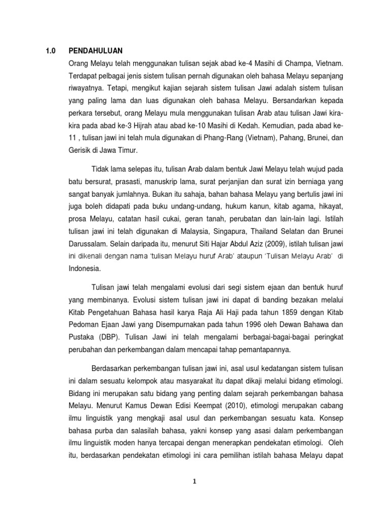 PENDAHULUAN Orang Melayu telah menggunakan tulisan sejak abad ke-4 Masihi di Champa, Vietnam. Terdapat pelbagai jenis sistem tulisan pernah digunakan oleh bahasa Melayu sepanjang riwayatnya. Tetapi, mengikut kajian sejarah sistem tulisan Jawi adalah sistem tulisan yang paling lama dan luas digunakan oleh bahasa Melayu. Bersandarkan kepada perkara tersebut, orang Melayu mula menggunakan tulisan Arab atau tulisan Jawi kirakira pada abad ke-3 Hijrah atau abad ke-10 Masihi di Kedah. Kemudian, pada abad ke11 , tulisan jawi ini telah mula digunakan di Phang-Rang (Vietnam), Pahang, Brunei, dan Gerisik di Jawa Timur. Tidak lama selepas itu, tulisan Arab dalam bentuk Jawi Melayu telah wujud pada batu bersurat, prasasti, manuskrip lama, surat perjanjian dan surat izin berniaga yang sangat banyak jumlahnya. Bukan itu sahaja, bahan bahasa Melayu yang bertulis jawi ini juga boleh didapati pada buku undang-undang, hukum kanun, kitab agama, hikayat, prosa Melayu, catatan hasil cukai, geran tanah, perubatan dan lain-lain lagi. Istilah tulisan jawi ini telah digunakan di Malaysia, Singapura, Thailand Selatan dan Brunei Darussalam. Selain daripada itu, menurut Siti Hajar Abdul Aziz (2009), istilah tulisan jawi ini dikenali dengan nama tulisan Melayu huruf Arab ataupun Tulisan Melayu Arab di Indonesia. Tulisan jawi telah mengalami evolusi dari segi sistem ejaan dan bentuk huruf yang membinanya. Evolusi sistem tulisan jawi ini dapat di banding bezakan melalui Kitab Pengetahuan Bahasa hasil karya Raja Ali Haji pada tahun 1859 dengan Kitab Pedoman Ejaan Jawi yang Disempurnakan pada tahun 1996 oleh Dewan Bahawa dan Pustaka (DBP). Tulisan Jawi ini telah mengalami berbagai-bagai-bagai peringkat perubahan dan perkembangan dalam mencapai tahap pemantapannya. Berdasarkan perkembangan tulisan jawi ini, asal usul kedatangan sistem tulisan ini dalam sesuatu kelompok atau masyarakat itu dapat dikaji melalui bidang etimologi. Bidang ini merupakan satu bidang yang penting dalam sejarah perkembangan bahasa Melayu. Menurut Kamus Dewan Edisi Keempat (2010), etimologi merupakan cabang ilmu linguistik yang mengkaji asal usul dan perkembangan sesuatu kata. Konsep bahasa purba dan salasilah bahasa, yakni konsep yang asasi dalam perkembangan ilmu linguistik moden hanya tercapai dengan menerapkan pendekatan etimologi. Oleh itu, berdasarkan pendekatan etimologi ini cara pemilihan istilah bahasa Melayu dapat