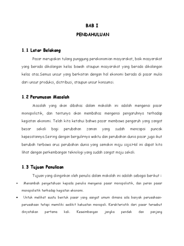 Masalah yang akan dibahas dalam makalah ini adalah mengenai pasar monopolistik, dan tentunya akan membahas mengenai pengaruhnya terhadap kegiatan ekonomi. Telah kita ketahui bahwa pasar membawa pengaruh yang sangat besar sekali bagi perubahan zaman yang sudah mencapai puncak