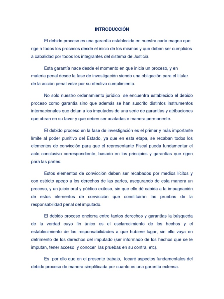 el inicio de los mismos y que deben ser cumplidos a cabalidad por todos los integrantes del sistema de Justicia. Esta garantía nace desde el momento en que inicia un proceso, y en materia penal desde la fase de investigación siendo una obligación para el titular de la acción penal velar por su efectivo cumplimiento. No solo nuestro ordenamiento jurídico se encuentra establecido el debido proceso como garantía sino que además se han suscrito distintos instrumentos internacionales que dotan a los imputados de una serie de garantías y atribuciones que obran en su favor y que deben ser acatadas e manera permanente. El debido proceso en la fase de investigación es el primer y más importante límite al poder punitivo del Estado, ya que en esta etapa, se recaban todos los elementos de convicción para que el representante Fiscal pueda fundamentar el acto conclusivo correspondiente, basado en los principios y garantías que rigen para las partes. Estos elementos de convicción deben ser recabados por medios lícitos y con estricto apego a los derechos de las partes, asegurando de esta manera un proceso, y un juicio oral y público exitoso, sin que ello dé cabida a la impugnación de estos elementos de convicción que constituirán las pruebas de la responsabilidad penal del imputado. El debido proceso encierra entre tantos derechos y garantías la búsqueda de la verdad cuyo fin único es el esclarecimiento de los hechos y el establecimiento de las responsabilidades a que hubiere lugar, sin ello vaya en detrimento de los derechos del imputado (ser informado de los hechos que se le imputan, tener acceso y conocer las pruebas en su contra, etc). Es por ello que en el presente trabajo, tocaré aspectos fundamentales del debido proceso de manera simplificada por cuanto es una garantía extensa.