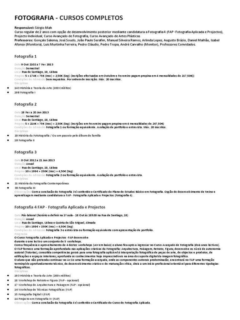 Data 18 Fev a 20 Jun 2013 Durao Semestral Local Rua de Santiago, 18, Lisboa Propina 5 x 214 + 75 (Insc) + 2,50 (Seg) (incries em Fevereiro pagam propina em 4 mensalidades de 267,50) Condies de Admisso Fotografia 1 ou formao equivalente. Avaliao de portfolio e entrevista. Mx. 20 inscritos. Disciplinas