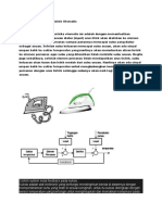 Mesin cuci ada yang pengisiannya dari depan, biasanya mesin cuci ini proses pencucian pakaian sudah otomatis mulai dari tahap pencucian sampai pengeringan. Yang kedua mesin cuci yang pengisiannya dari atas, ada yang otomatis ada juga yang tidak. Tapi pada prinsipnya cara kerja mesin cuci baik yang manual maupun otomatis hampir sama. 1. Cara kerja Mesin Cuci : Pertama pakaian kotor dimasukan kedalam drum atau bak mesin cuci. Kontrol (alat elektronik yang mengatur semua pergerakan mesin cuci) akan mendeteksi berapa berat dari pakaian (dengan mengetahui berapa beban motor), setelah berat pakaian diketahui kontrol akan mengatur level air, waktu cuci, waktu bilas, waktu pengeringan, dan membuka katup air masuk (water inlet valve). Setelah level air tercapai katup air masuk akan ditutup dan agitator mulai berputar untuk menciptakan putaran air. Bila kontrol telah mendeteksi waktu cuci habis, motor akan berhenti memutar agitator dan katup buang pun dibuka sehingga air hasil pencucian dibuang keluar. Setelah air buangan di buang, drum tempat pakaian akan berputar untuk membuang sisa-sisa air yang ada di dalam pakain. Setelah itu katup bilas ditutup dan katup air masuk dibuka air pun masuk ke drum mesin cuci, bila level sudah sampai katup air masuk pun ditutup dan mesin cuci pun mulai membilas. Jika waktu bilas sudah habis, maka kontrol akan membuka katup buang dan air bilasan pun keluar. Setelah itu proses pengeringan pun dilakukan dengan jalan memutar drum mesin cuci. Jika waktu pengeringan sudah habis maka mesin cuci pun berhenti secara otomatis dan proses pencucian telah selesai. 1. Prinsip Kerja Pemanggang Roti / Toaster Toaster merupakan salah satu alat rumah tangga yang digunakan untuk memanaskan roti sebagai makanan pagi bagian bagi orang-orang tertentu.