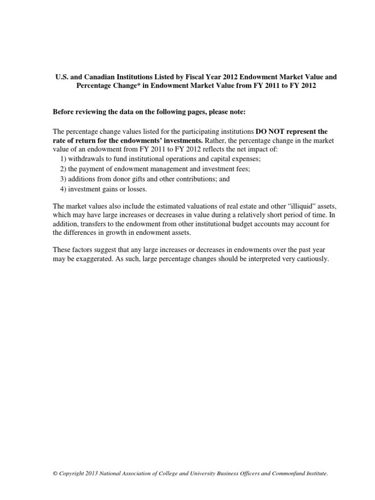 Before reviewing the data on the following pages, please note: The percentage change values listed for the participating institutions DO NOT represent the rate of return for the endowments investments. Rather, the percentage change in the market value of an endowment from FY 2011 to FY 2012 reflects the net impact of: 1) withdrawals to fund institutional operations and capital expenses; 2) the payment of endowment management and investment fees; 3) additions from donor gifts and other contributions; and 4) investment gains or losses. The market values also include the estimated valuations of real estate and other illiquid assets, which may have large increases or decreases in value during a relatively short period of time. In addition, transfers to the endowment from other institutional budget accounts may account for the differences in growth in endowment assets. These factors suggest that any large increases or decreases in endowments over the past year may be exaggerated. As such, large percentage changes should be interpreted very cautiously.