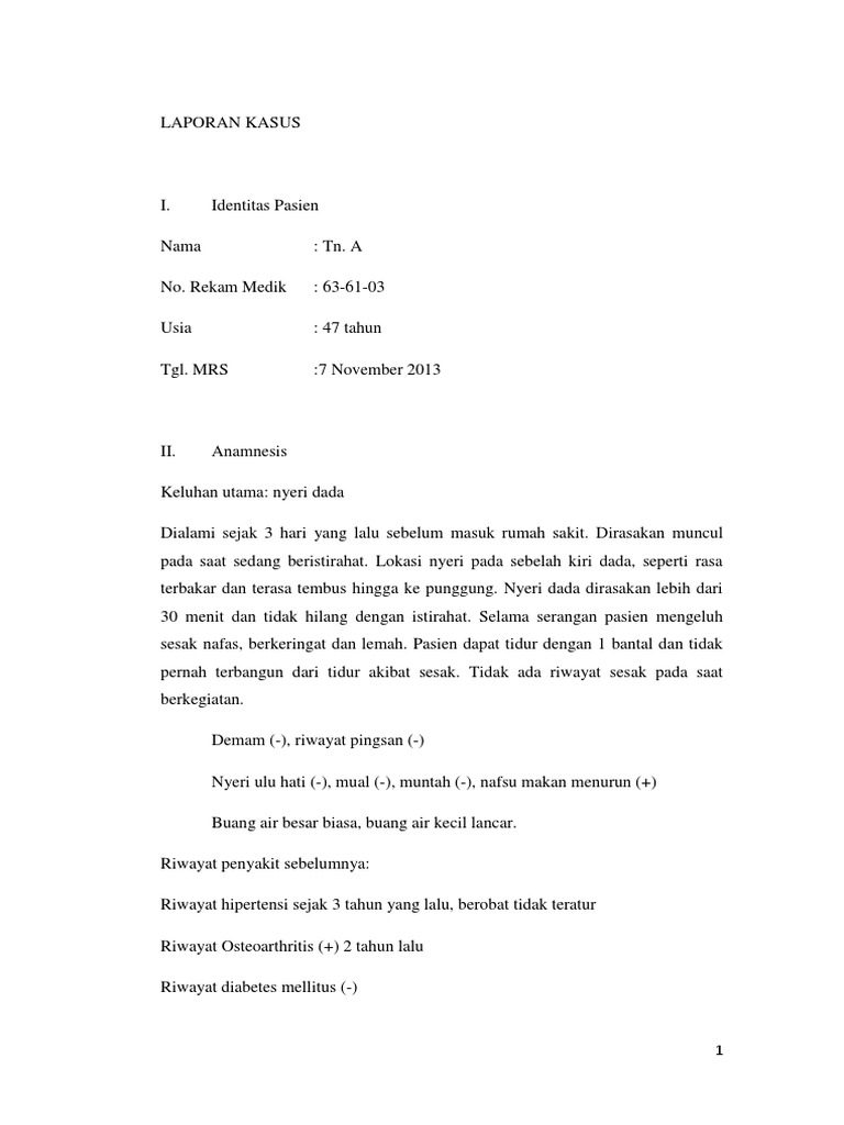 Keluhan utama: nyeri dada Dialami sejak 3 hari yang lalu sebelum masuk rumah sakit. Dirasakan muncul pada saat sedang beristirahat. Lokasi nyeri pada sebelah kiri dada, seperti rasa terbakar dan terasa tembus hingga ke punggung. Nyeri dada dirasakan lebih dari 30 menit dan tidak hilang dengan istirahat. Selama serangan pasien mengeluh sesak nafas, berkeringat dan lemah. Pasien dapat tidur dengan 1 bantal dan tidak pernah terbangun dari tidur akibat sesak. Tidak ada riwayat sesak pada saat berkegiatan. Demam (-), riwayat pingsan (-) Nyeri ulu hati (-), mual (-), muntah (-), nafsu makan menurun (+) Buang air besar biasa, buang air kecil lancar. Riwayat penyakit sebelumnya: Riwayat hipertensi sejak 3 tahun yang lalu, berobat tidak teratur Riwayat Osteoarthritis (+) 2 tahun lalu Riwayat diabetes mellitus (-)