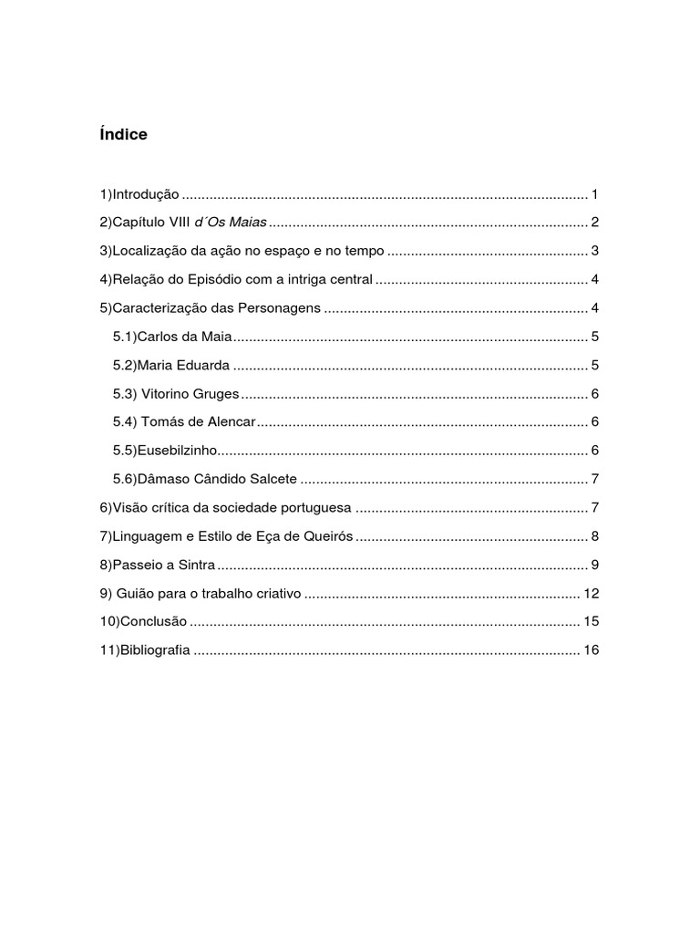 1)Introduo ....................................................................................................... 1 2)Captulo VIII dOs Maias ................................................................................. 2 3)Localizao da ao no espao e no tempo ................................................... 3 4)Relao do Episdio com a intriga central ...................................................... 4 5)Caracterizao das Personagens ................................................................... 4 5.1)Carlos da Maia .......................................................................................... 5 5.2)Maria Eduarda .......................................................................................... 5 5.3) Vitorino Gruges ........................................................................................ 6 5.4) Toms de Alencar .................................................................................... 6 5.5)Eusebilzinho.............................................................................................. 6 5.6)Dmaso Cndido Salcete ......................................................................... 7 6)Viso crtica da sociedade portuguesa ........................................................... 7 7)Linguagem e Estilo de Ea de Queirs ........................................................... 8 8)Passeio a Sintra .............................................................................................. 9 9) Guio para o trabalho criativo ...................................................................... 12 10)Concluso ................................................................................................... 15 11)Bibliografia .................................................................................................. 16