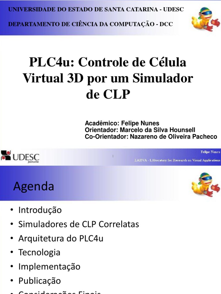 Levantamento de simuladores de CLP de forma traar estratgias: Uso de planta virtual 3D; Simulador de cdigo aberto; Uso de implementao formal e flexvel (compilador), devido a variedades de linguagens/fabricantes. Desenvolver um simulador de CLP que controle uma clula de manufatura 3D;