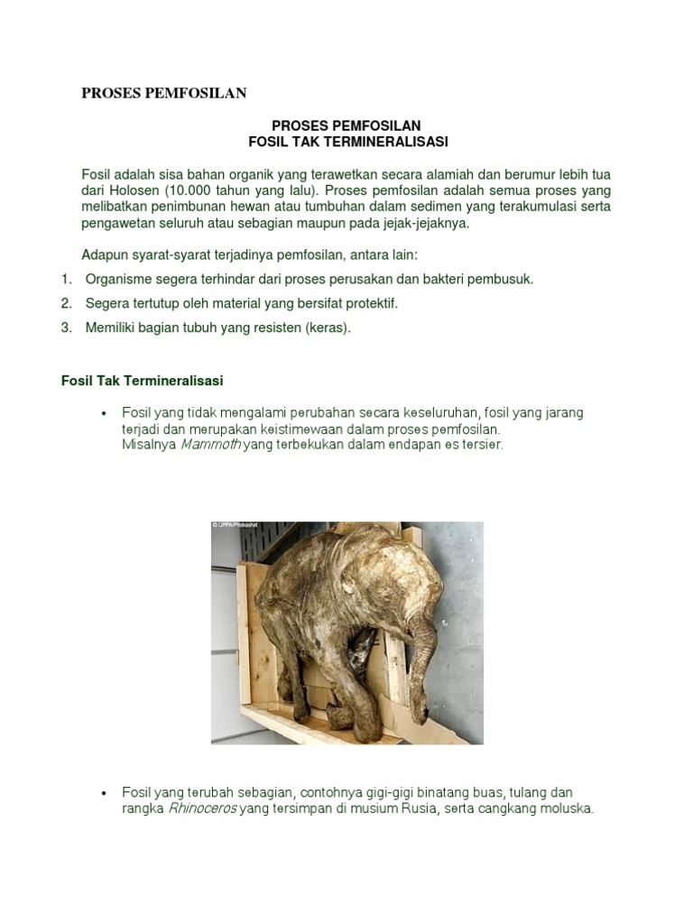 PROSES PEMFOSILAN FOSIL TAK TERMINERALISASI Fosil adalah sisa bahan organik yang terawetkan secara alamiah dan berumur lebih tua dari Holosen (10.000 tahun yang lalu). Proses pemfosilan adalah semua proses yang melibatkan penimbunan hewan atau tumbuhan dalam sedimen yang terakumulasi serta pengawetan seluruh atau sebagian maupun pada jejak-jejaknya. Adapun syarat-syarat terjadinya pemfosilan, antara lain: 1. Organisme segera terhindar dari proses perusakan dan bakteri pembusuk. 2. Segera tertutup oleh material yang bersifat protektif. 3. Memiliki bagian tubuh yang resisten (keras).